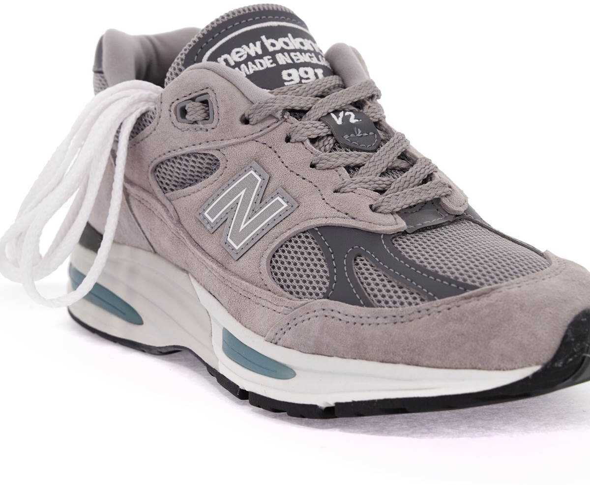 The New Balance 991v2 Made in UK sneakers feature a suede and mesh upper with classic N side panels made of reflective material. They have a front lacing system, contrast embroidered lettering on the tongue, and a lined interior with a removable insole. These shoes also boast a Full-Length FuelCell midsole, ABZORB SBS capsules, and ENCAP cushioning for maximum comfort. The rubber sole provides excellent traction, while extra laces are included as accessories.