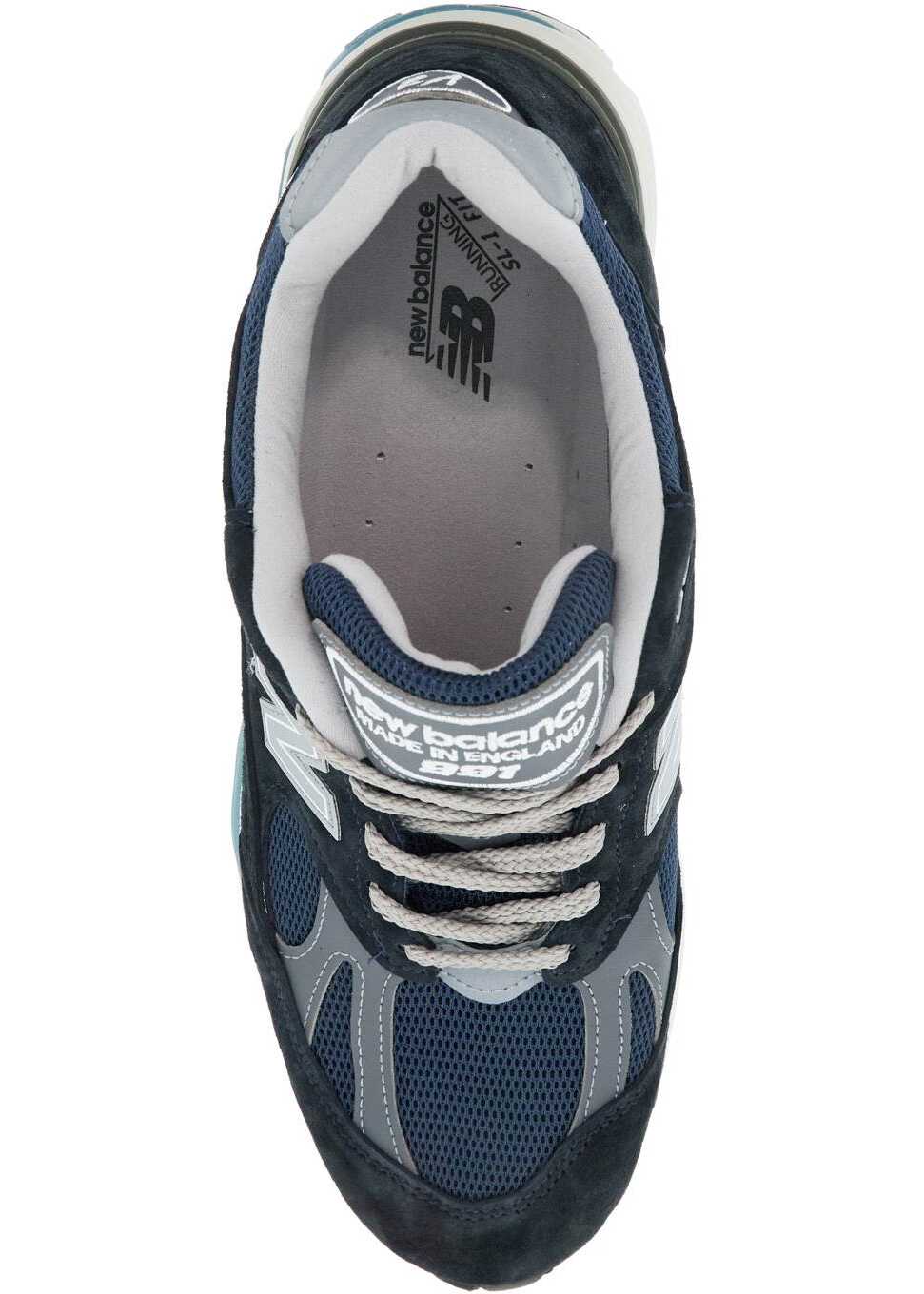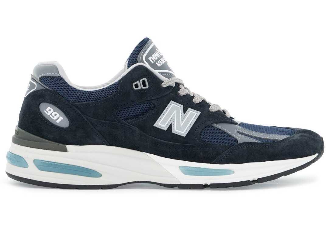 The New Balance 991 Made in UK sneakers feature a mesh and suede leather upper with contrasting smooth leather inserts, iconic monogram 'N' patch on the sides, and reflective details. Embroidered 991 and V2 on the back, leather logo patch on the tongue, fabric lining with removable insole, ABZORB midsole, and rubber sole.
