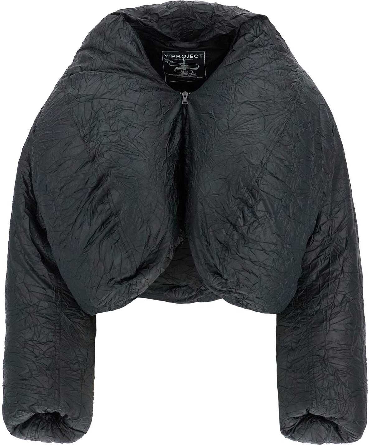 The Y/Project cropped puffer jacket is made of crinkled fabric and filled with synthetic padding. It stands out for its sculptural design with oversized volumes, a central zip, and elasticized cuffs. The model is 177 cm tall and wears a size FR 36.