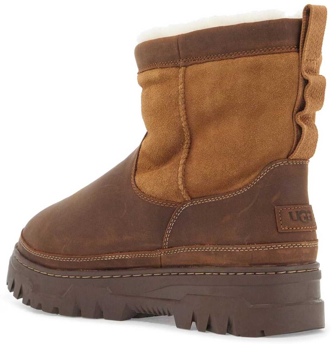 The UGG Heritage Pull-On TrailGazer boots feature an oiled and waterproof leather and suede upper with sealed seams. They also have ribbon pull tabs, a lining made of regenerated wool in UGGplushâ¢, and a White Spider Rubber sole.