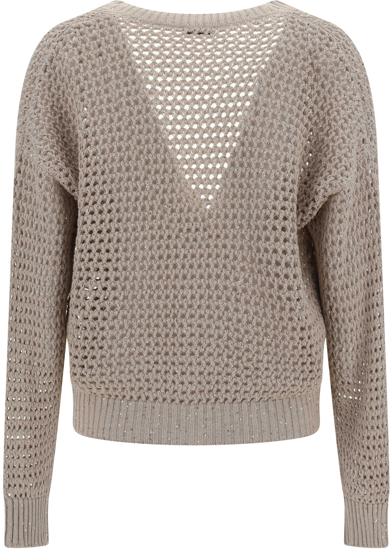 Cotton Cardigan by Brunello Cucinelli, featuring front button closure, ribbed cuffs, v-neck with ribbed trim, all-over bright sequin crochet design, high ribbed hem, regular fit.