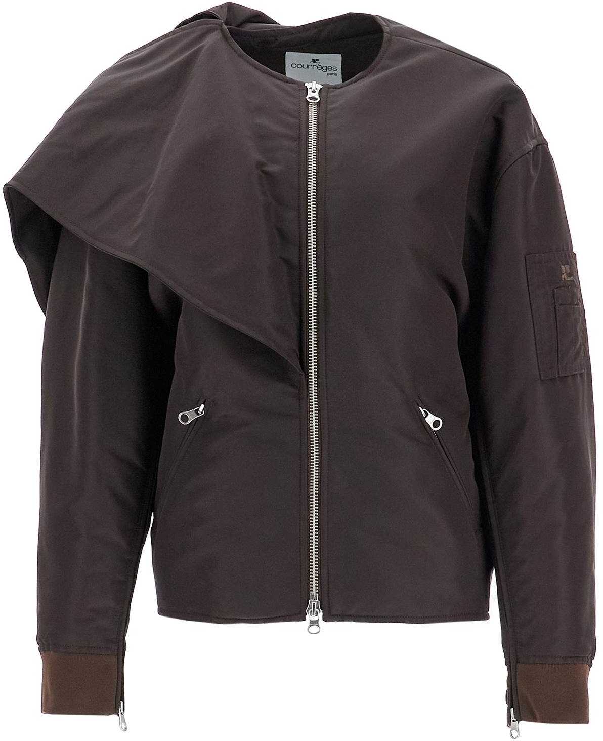 Courrè ges blouson made of shiny nylon, enriched with knot panels on the shoulders. It features a round neck, two-way zip closure, slanted pockets and sleeves with zip openings. Enriched with ribbed jersey details inspired by bomber jackets. Lined and equipped with an inner pocket. Oversized fit with dropped shoulders. The model is 177 cm tall and wears a size S.