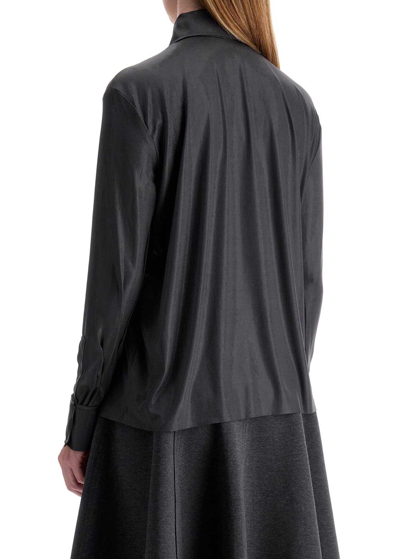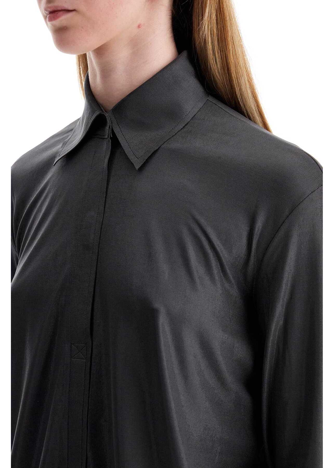 Crafted in poly lycra lamé, this Norma Kamali shirt stands out for its fluid line and essential design accentuated by laser-cut edges. It features split cuffs and a decorative flap on the front with a velcro closure only at the neck. The model is 177 cm tall and wears size XS.