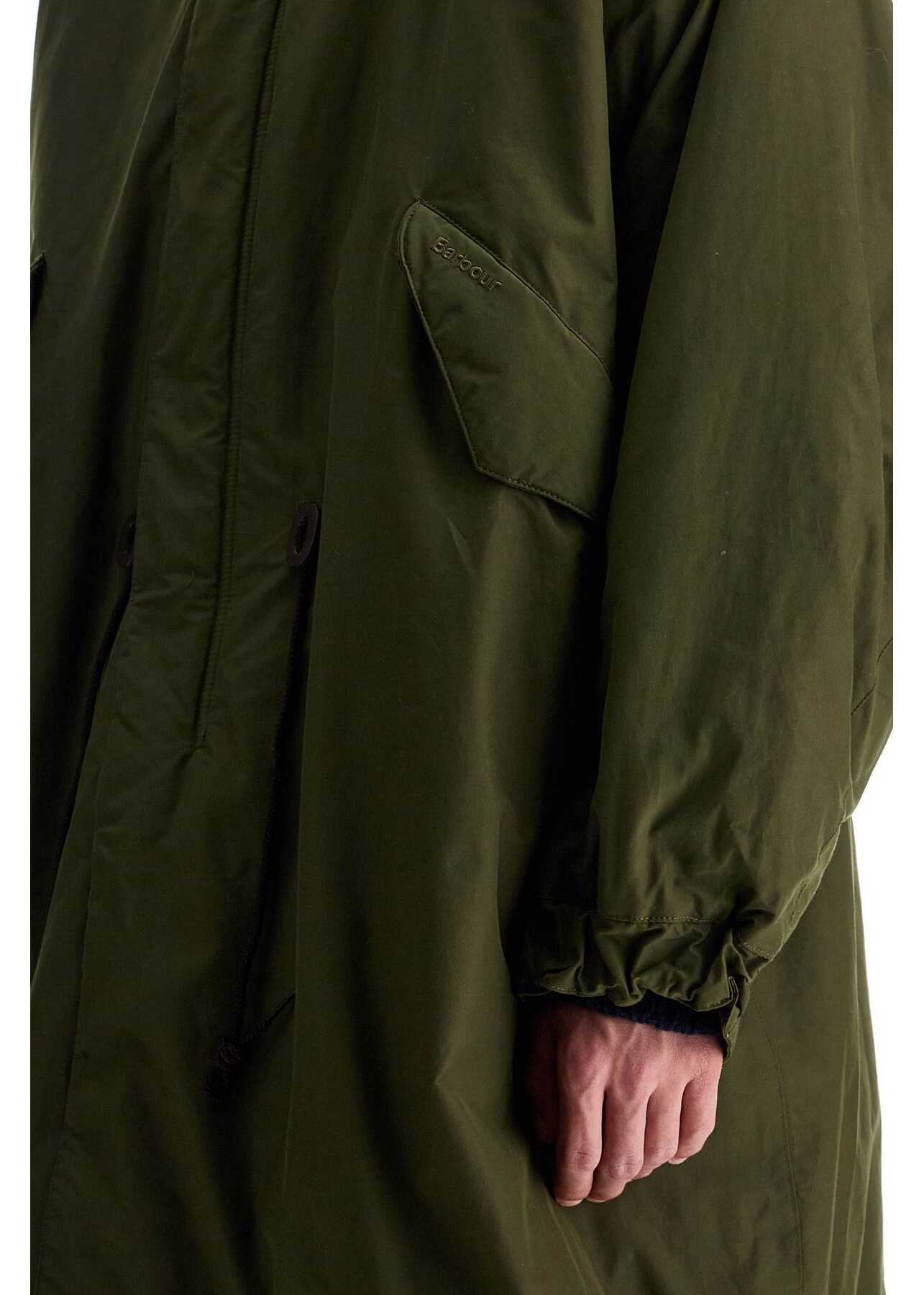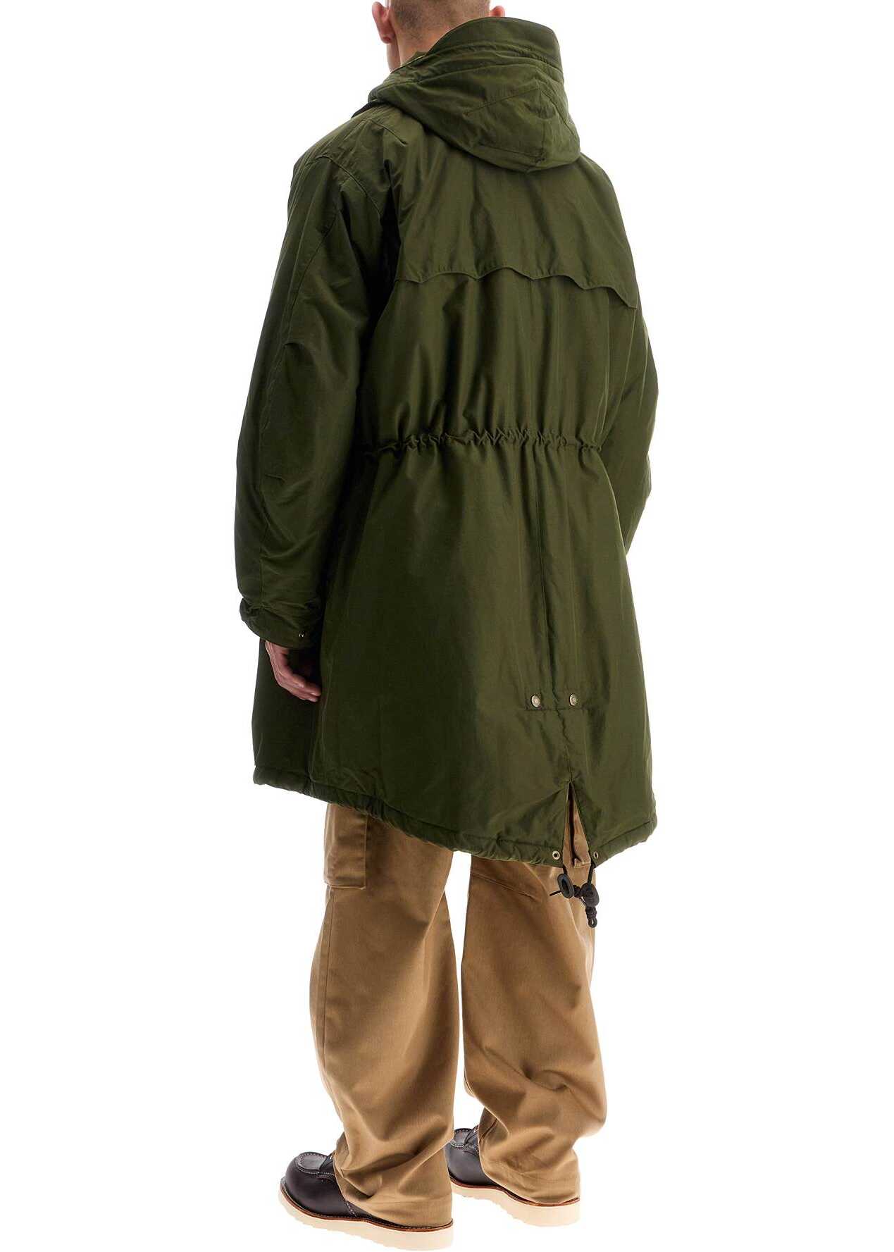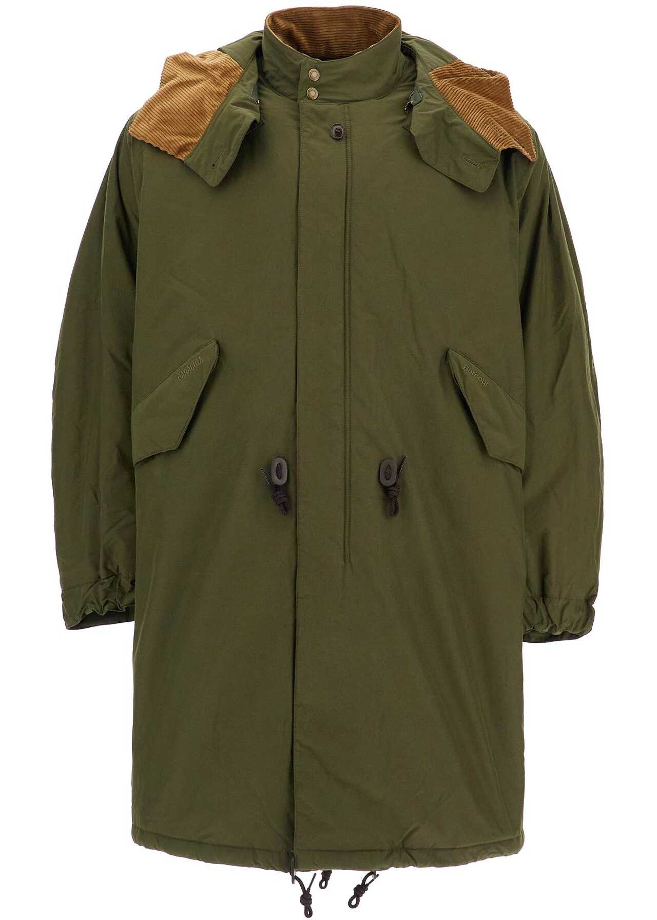 This Barbour x Baracuta parka is made from technical cotton fabric, lightly padded and lined with a patchwork effect tartan fabric featuring a patch pocket. It has a stand-up collar with a removable hood lined in corduroy, hidden double zip closure with snap buttons, flap pockets with hidden snap buttons for hand warming, and semi-elasticated cuffs with two buttons. The oversized fit can be adjusted with drawstrings at the waist and hem, and it is completed with a characteristic