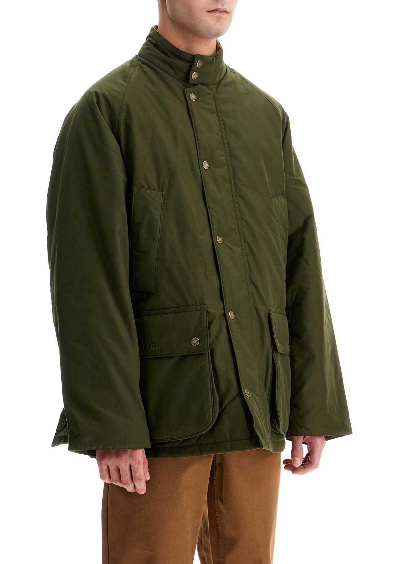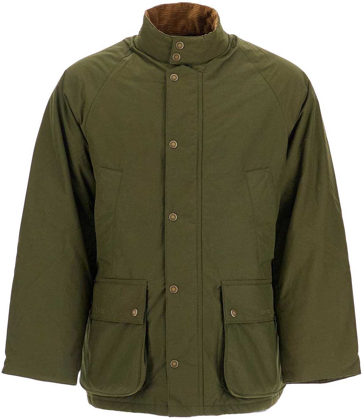 This Barbour x Baracuta jacket from the collection is made of lightweight technical cotton fabric with light padding, featuring a soft cut enhanced by adjustable raglan sleeves at the bottom with snap buttons. It has a stand-up collar lined in corduroy, a hidden double-slider zip closure with branded snaps, flap pockets and slanted chest pockets. Lined in tartan fabric and equipped with an inner pocket. Completed by a characteristic umbrella yoke and openable side vents on the back. The