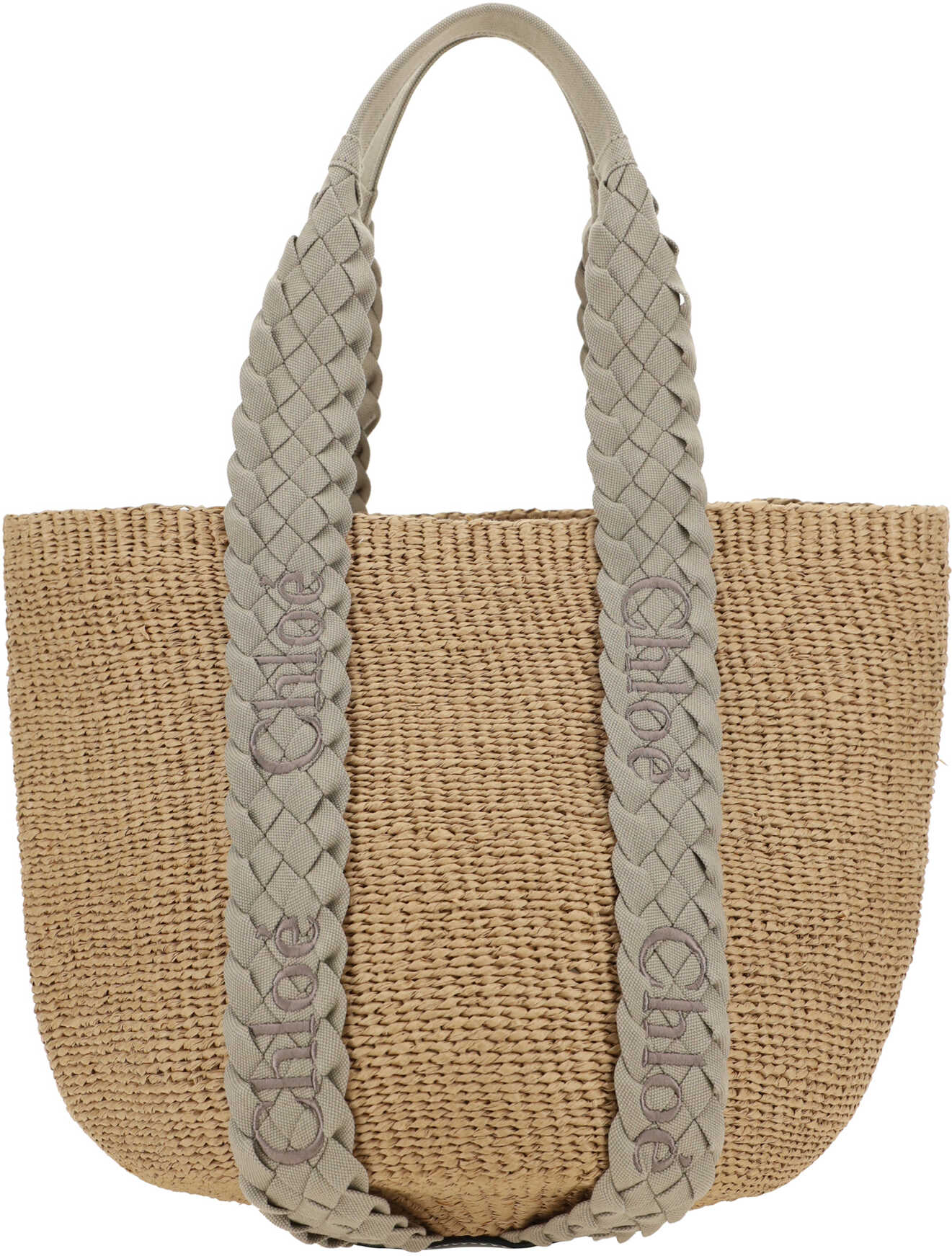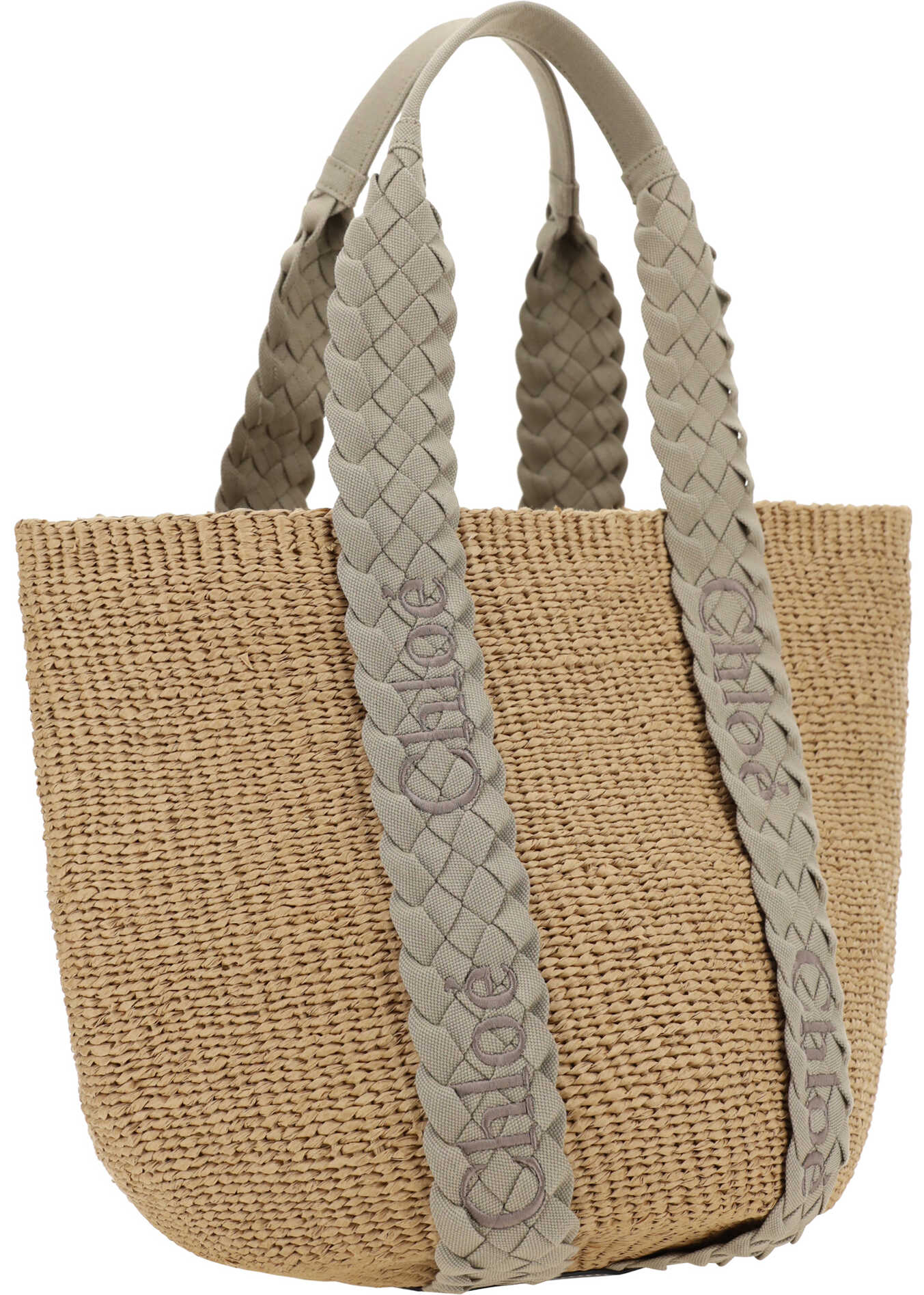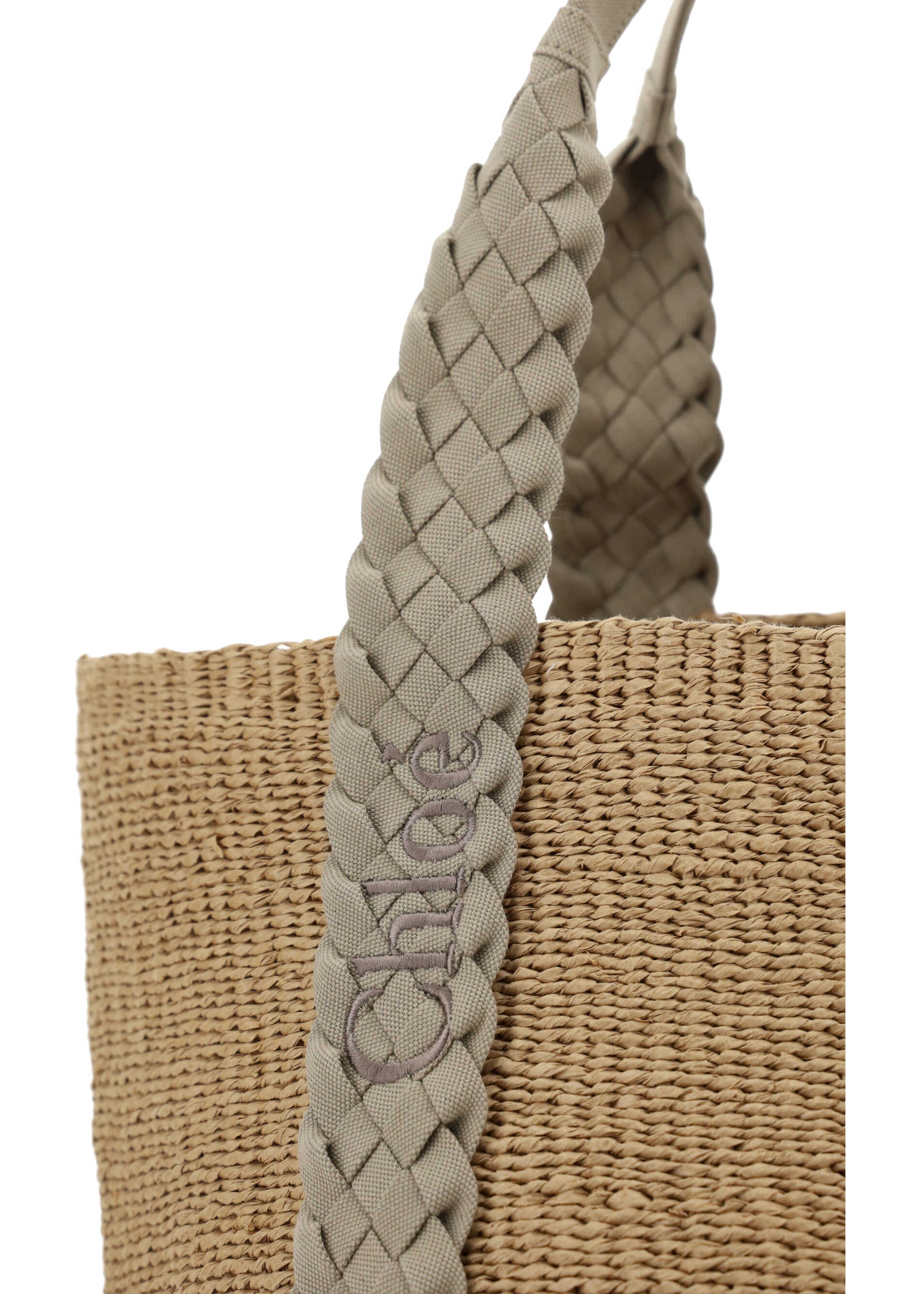 Woody Shoulder Bag by Chloé, double woven fabric handles, iconic brand monogram stitched on handles, straw design, single compartment.