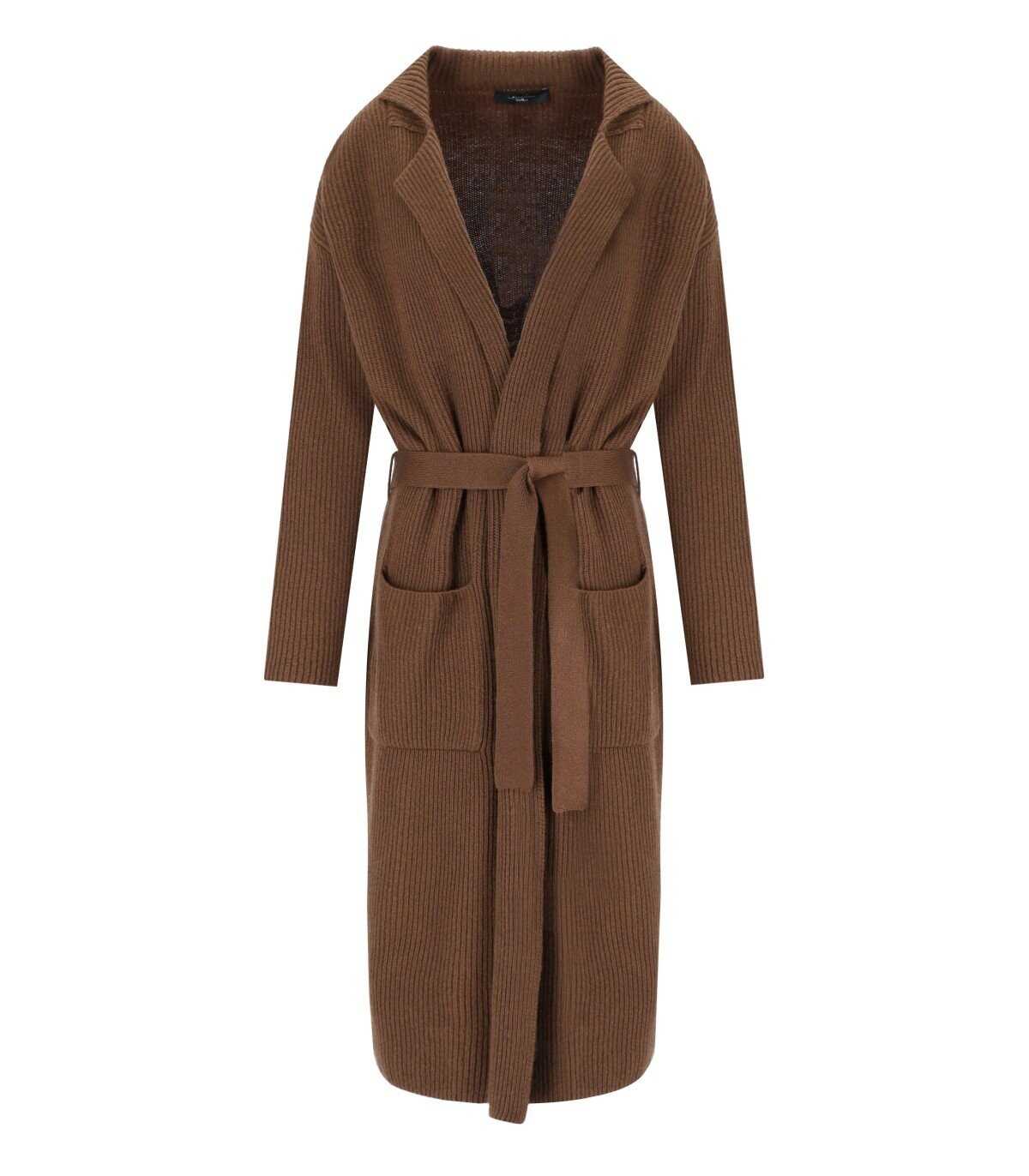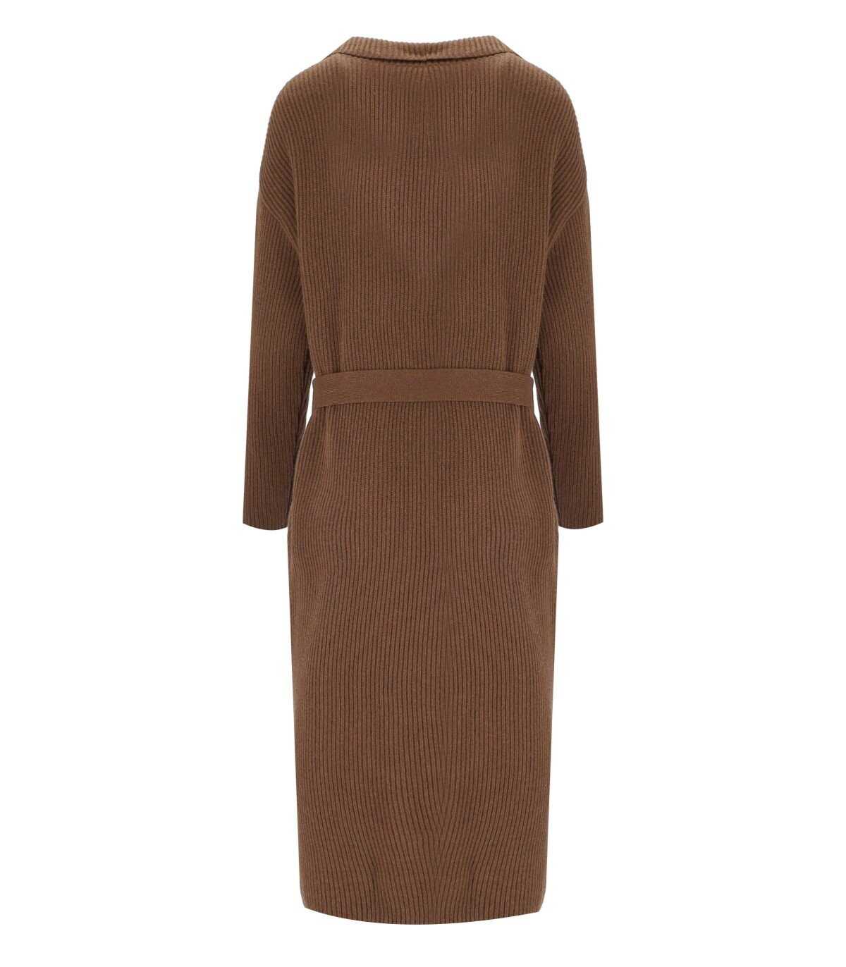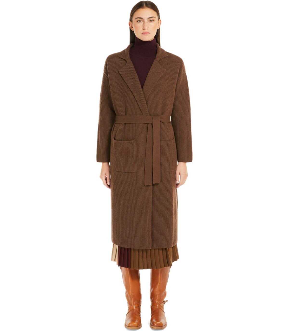 Kabul long cardigan by Max Mara Weekend made of pure virgin wool in a leather hue. Characterized by a lapel collar, it features applied pockets on the front and a coordinated belt to emphasize the silhouette. Adorned with an English ribbed pattern, it has dropped shoulders. Oversized fit.