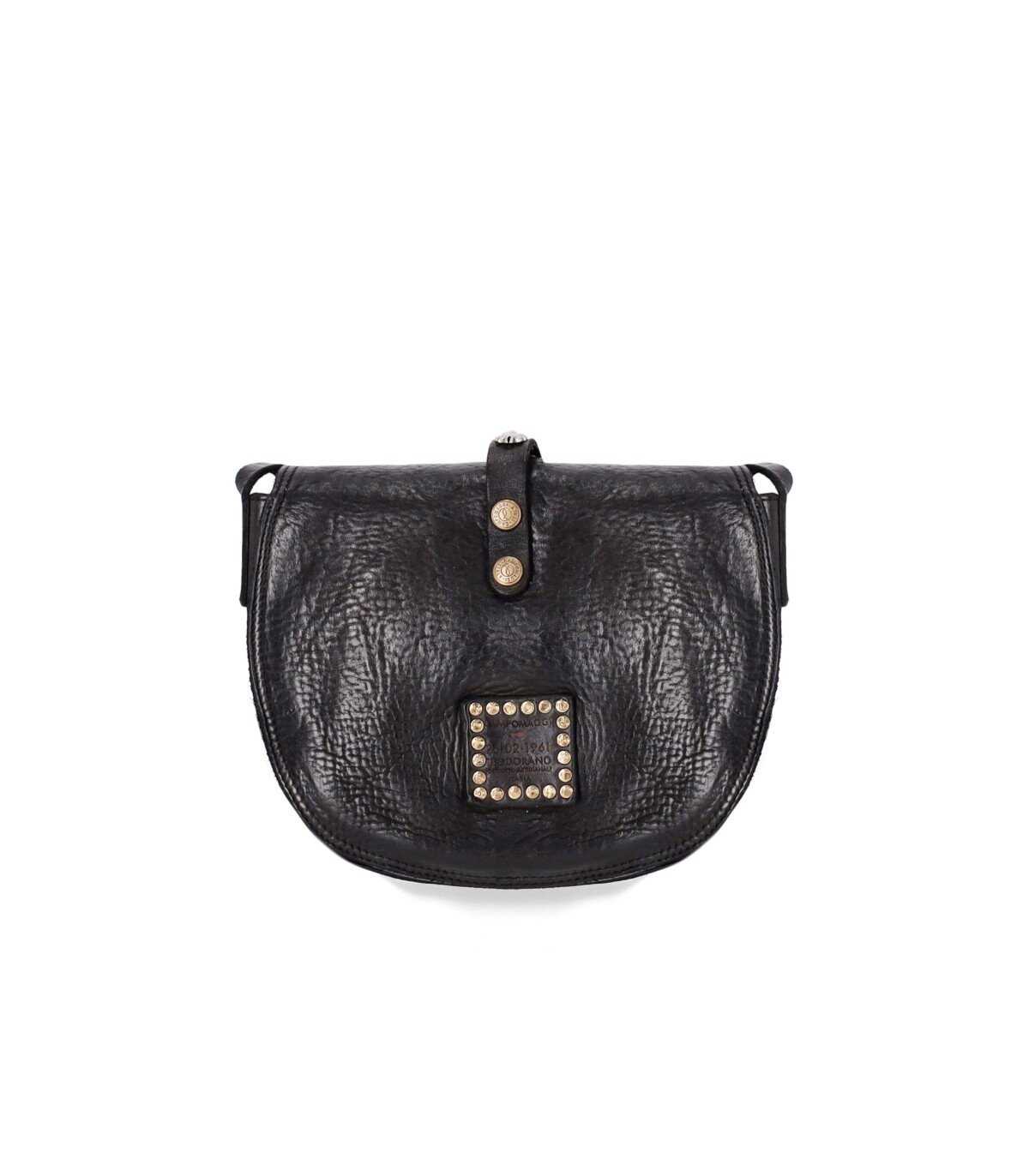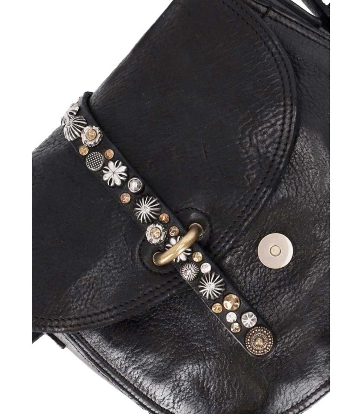 Cefalù crossbody bag by Campomaggi made of washed cowhide leather in black. Characterized by a magnetic 'tic tuc' closure adorned with flower-shaped accessories in gold and silver metal, it features an adjustable strap. The inner lining has two compartments. Comes with a cotton dust bag. Dimensions 22x5x20 cm.