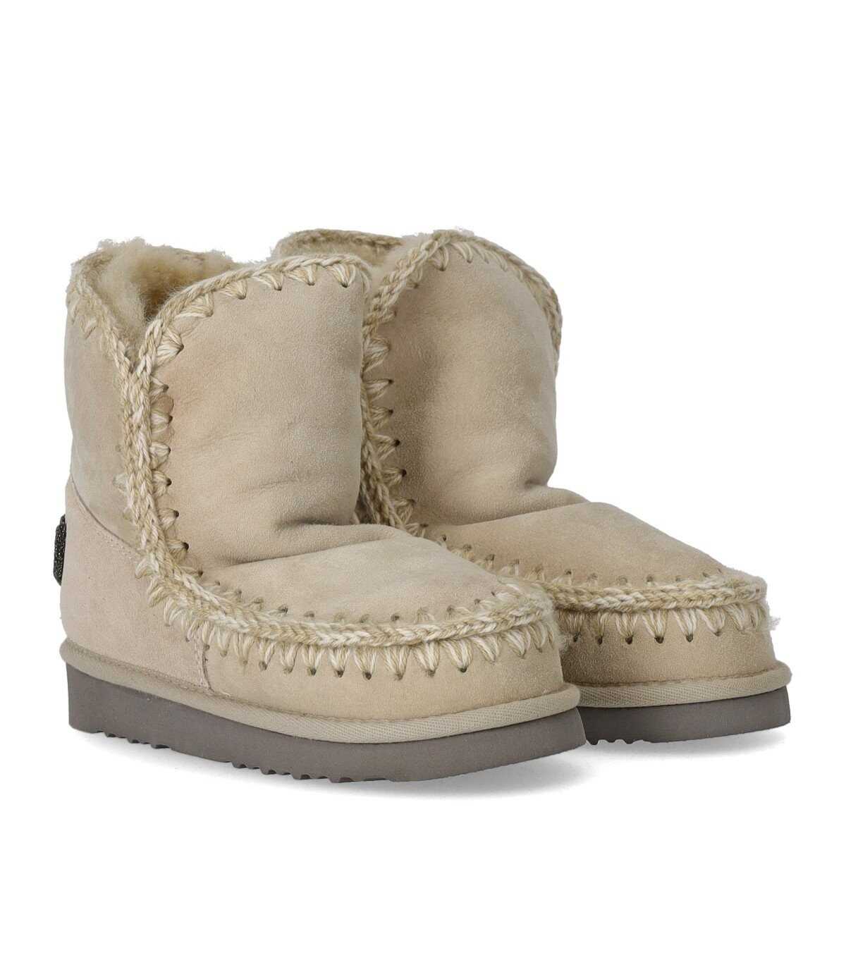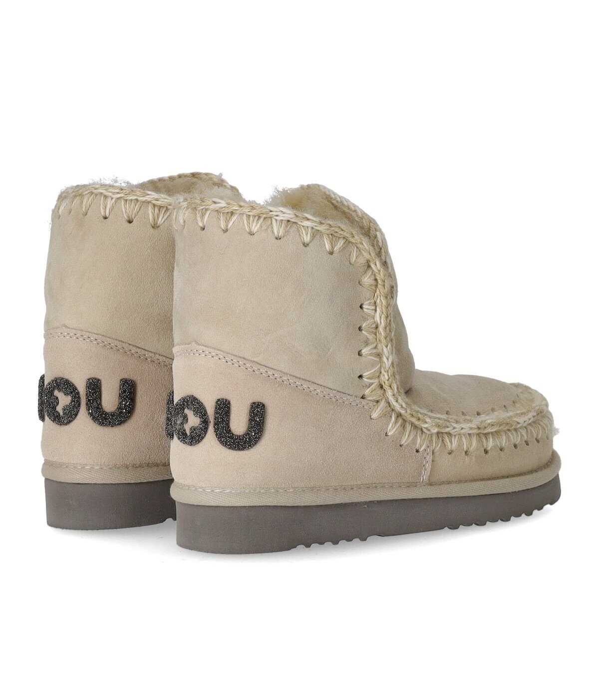 Eskimo 18 ankle boots by Mou made of hand-crafted double-faced sheepskin, featuring wool details in chalk color. Enhanced with a glittered logo, it has a reinforced heel and an EVA rubber outsole for a comfortable and durable fit. Sole height, 18 cm. Regular fit.