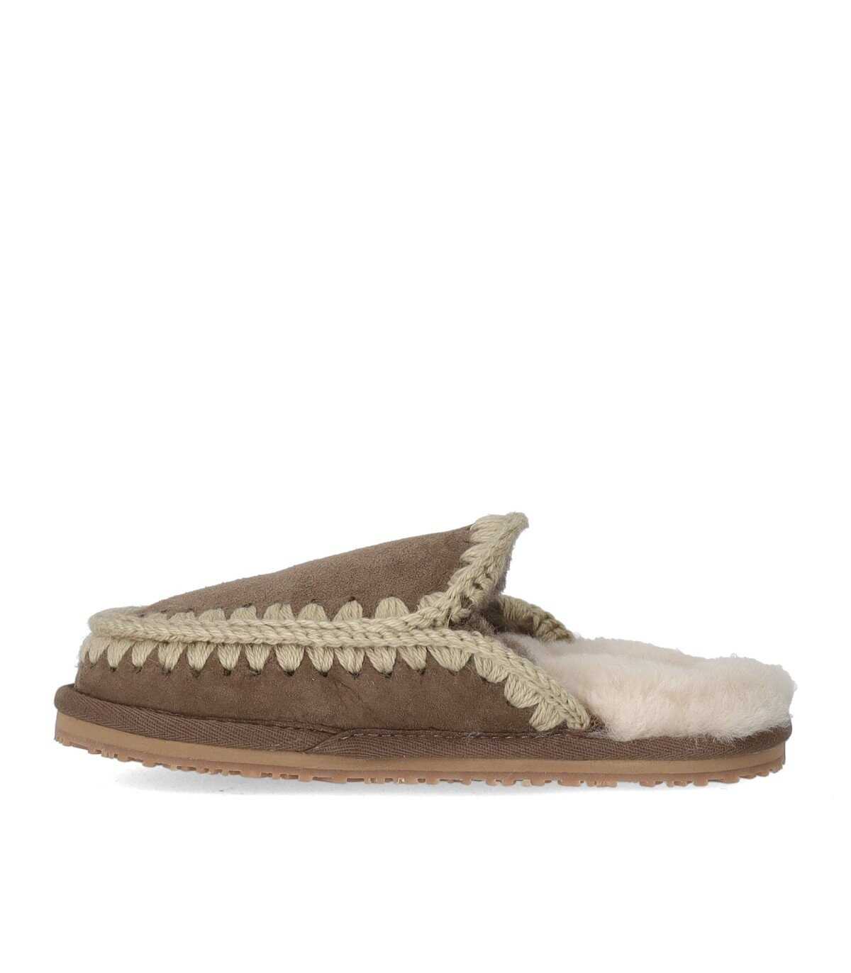 Mou Full Eskimo Stitch slippers made of real taupe sheepskin. Characterized by distinctive suede eskimo stitching, crocheted along the edges, it features a warm sheepskin-lined interior. EVA rubber sole, height 2 cm.