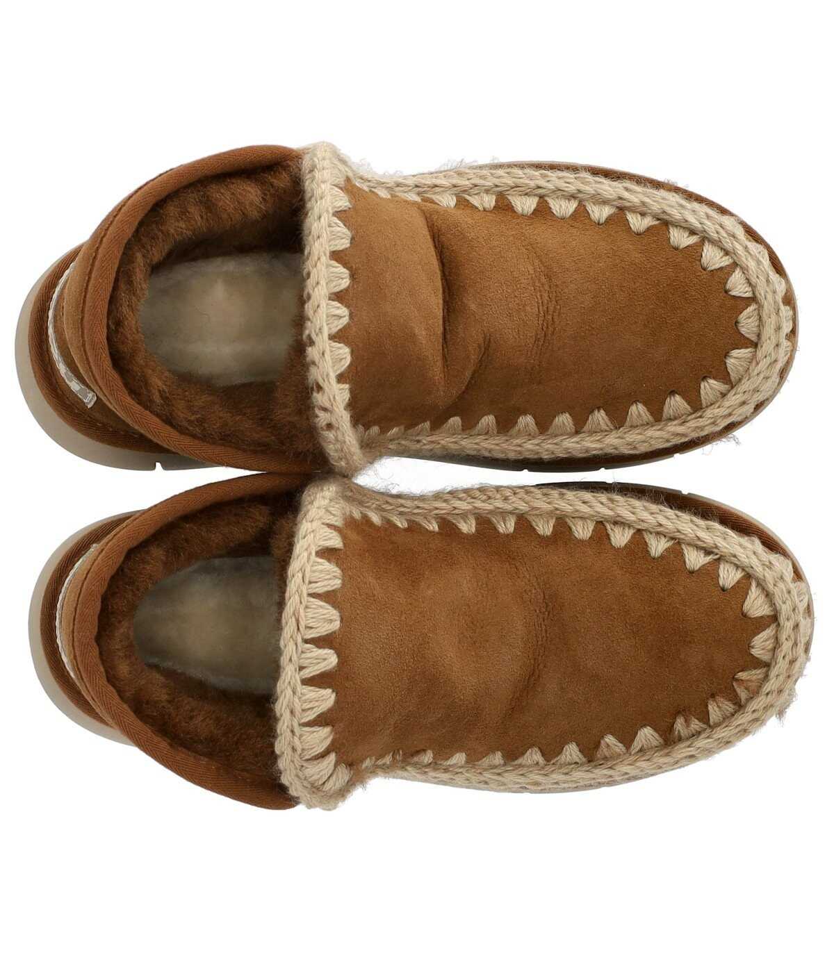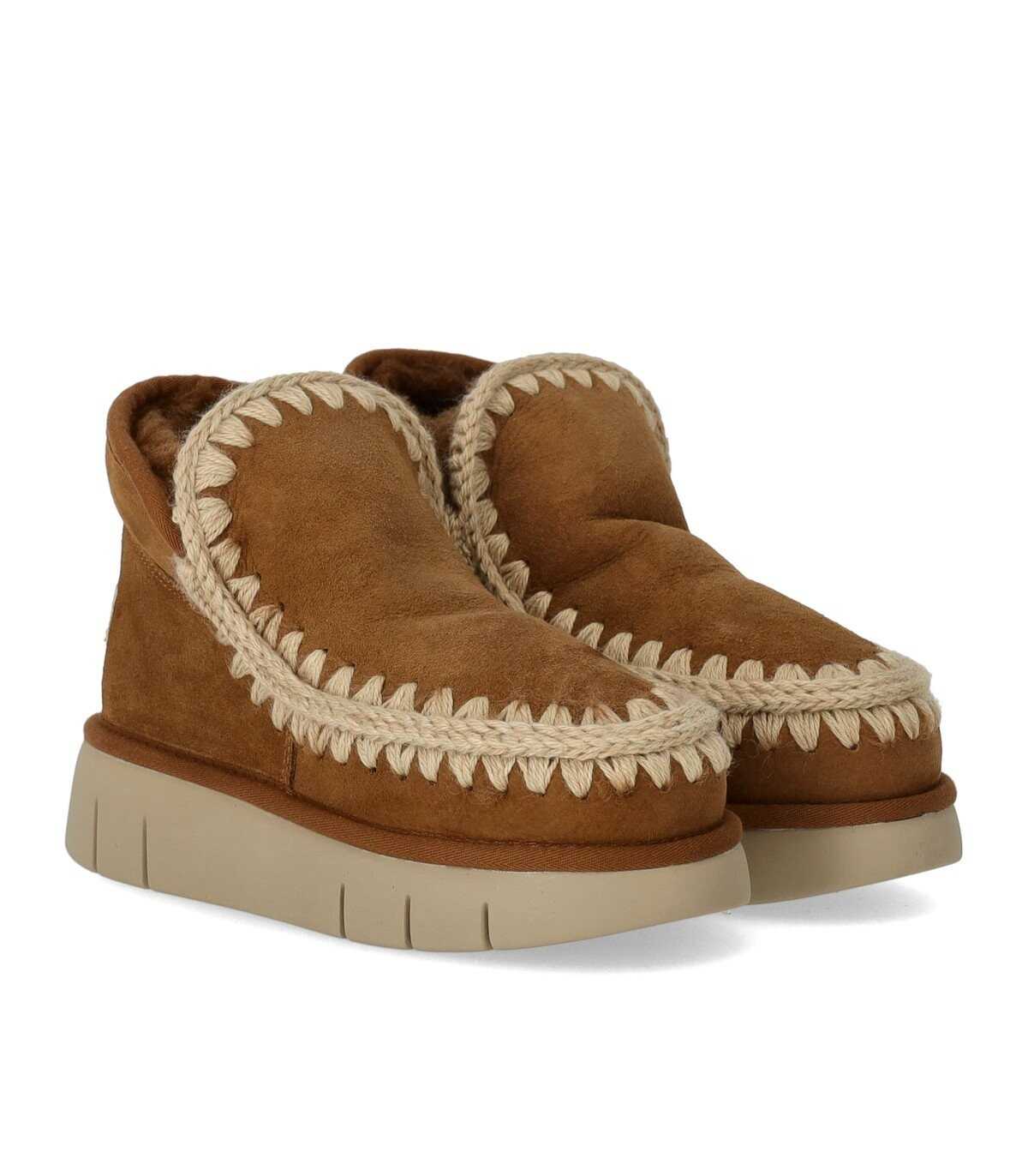 Mou Eskimo Bounce sneaker handmade in genuine double-faced sheepskin leather, in a cognac color shade. Characterized by distinctive crochet wool stitching, it features a padded leather insole. Equipped with a lightweight EVA rubber sole. Sole height, 4 cm.