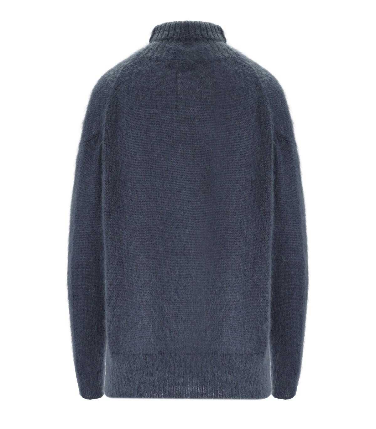 Sabine jumper by Cruna made of mohair fabric in a midnight blue color. It features a high ribbed collar and long sleeves finished with ribbed cuffs. Ribbed hem. Loose fit.