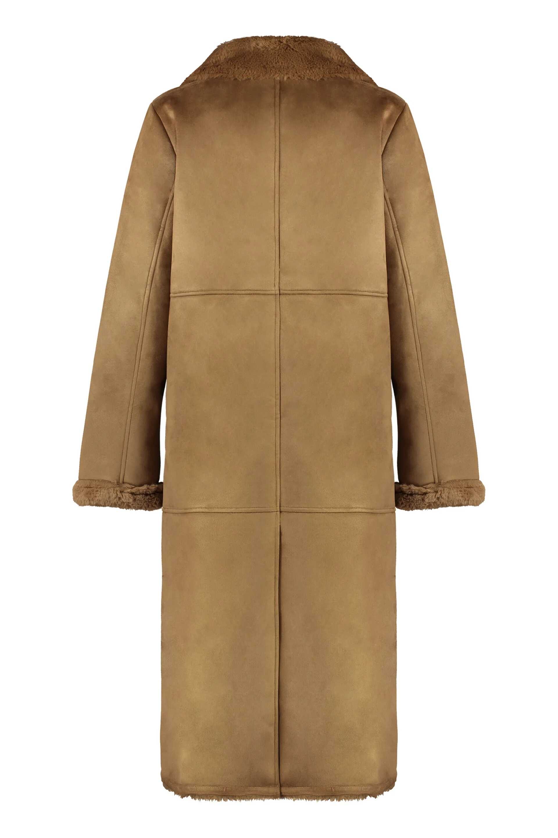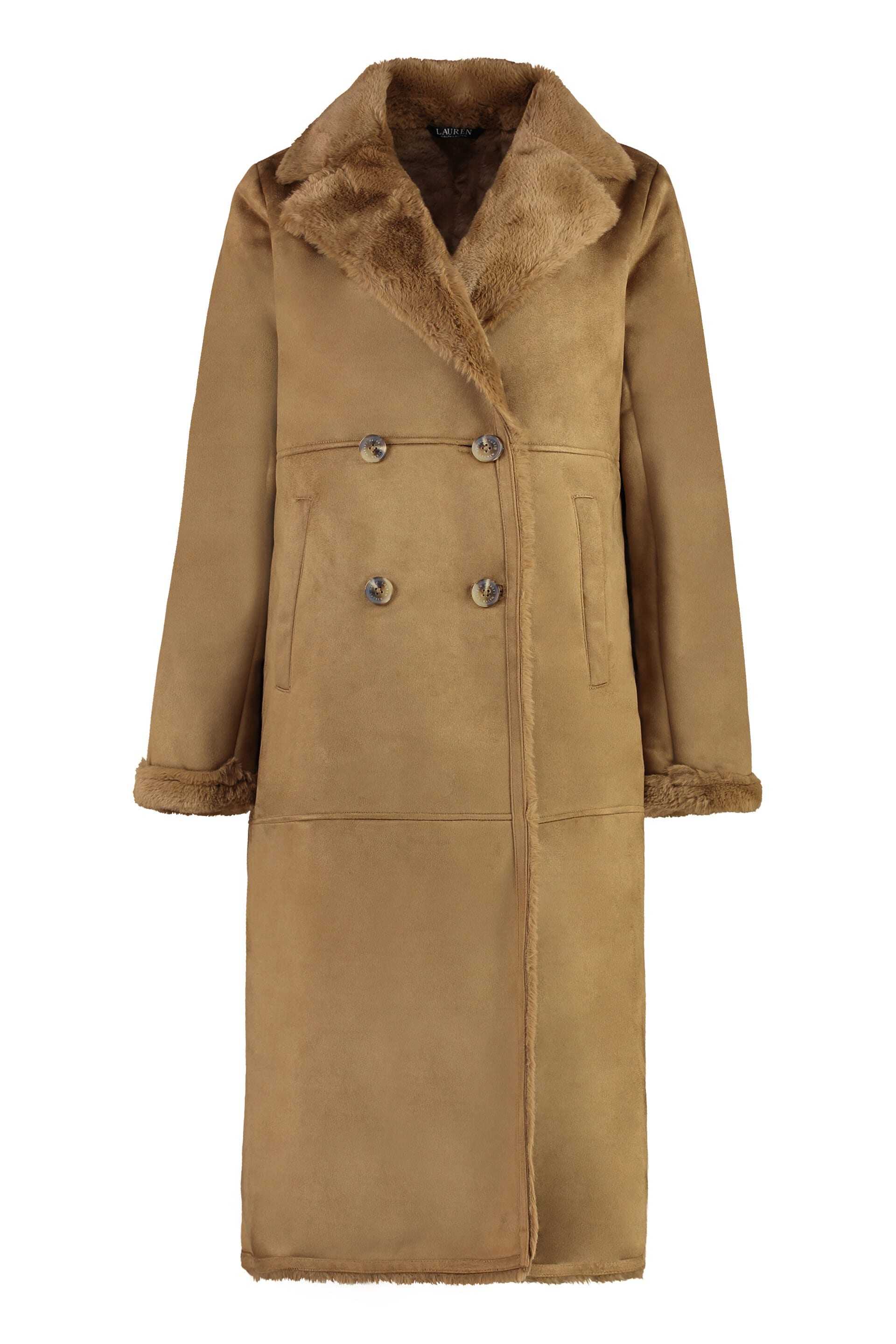 `LAUREN RALPH LAUREN coat with lace-edged faux fur lapels. Double-breasted silhouette. Horn-effect buttons with "Lauren Ralph Lauren" engraving. Long sleeves with faux fur-trimmed cuffs. Two front flap pockets at waist. Back hem with slit. Exterior and lining in faux fur.`