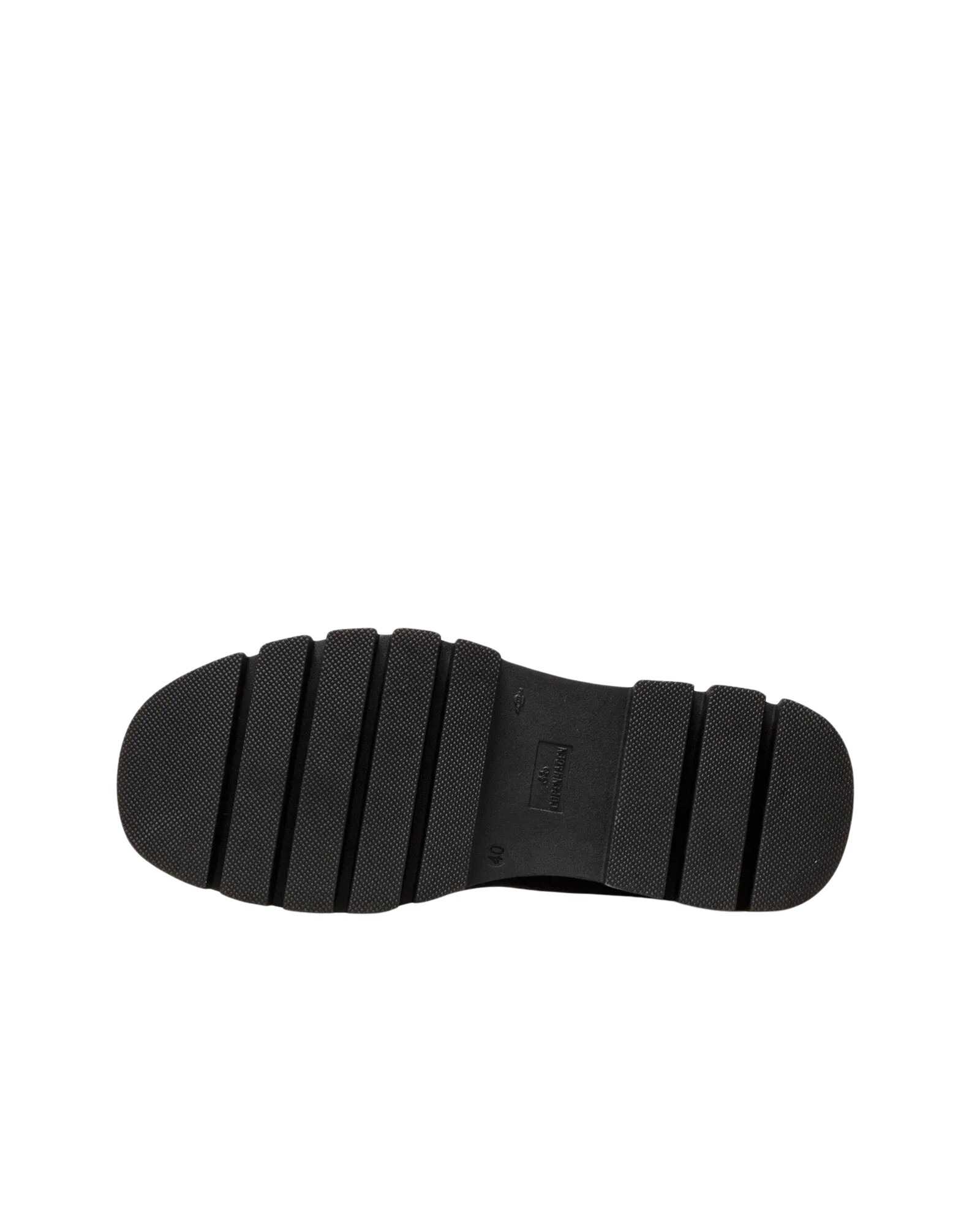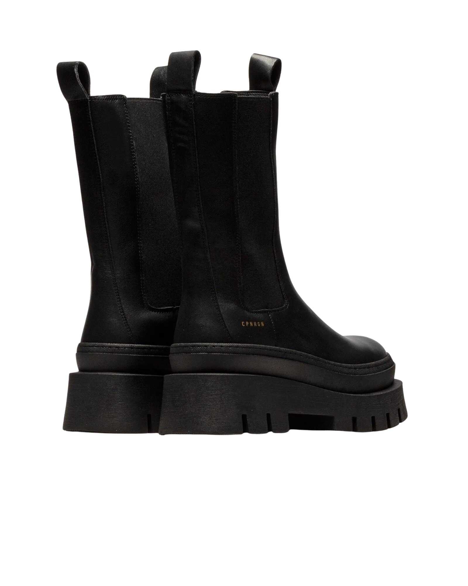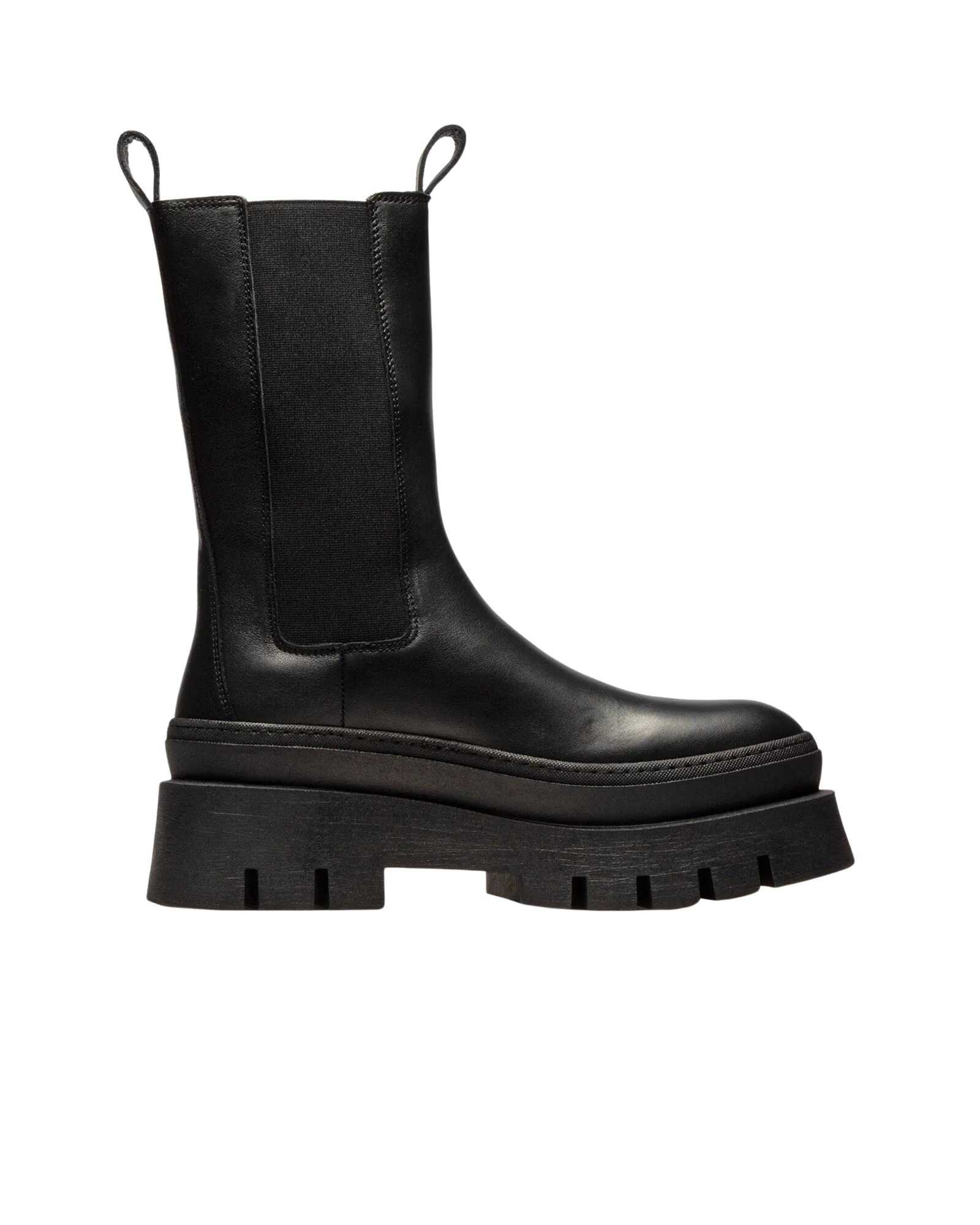 Chelsea ankle boots made of soft smooth leather. Robust silhouette. Elastic inserts with embroidered details. Gold logo on the outer side. Round toe. Platform sole with distinctive profile and wide heel.