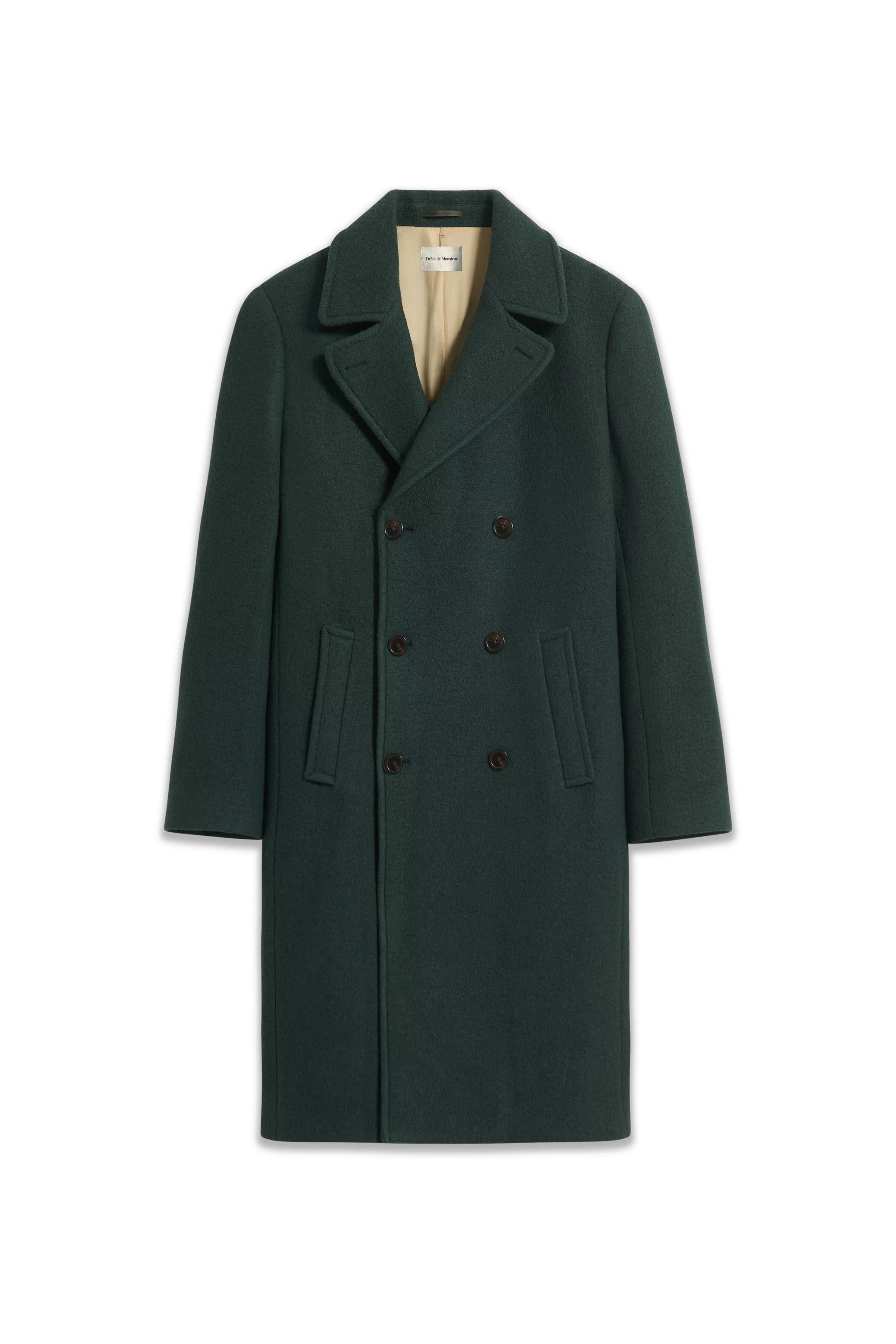 "FUNNY SIR wool double-breasted coat with peak lapels, lined, two side pockets."