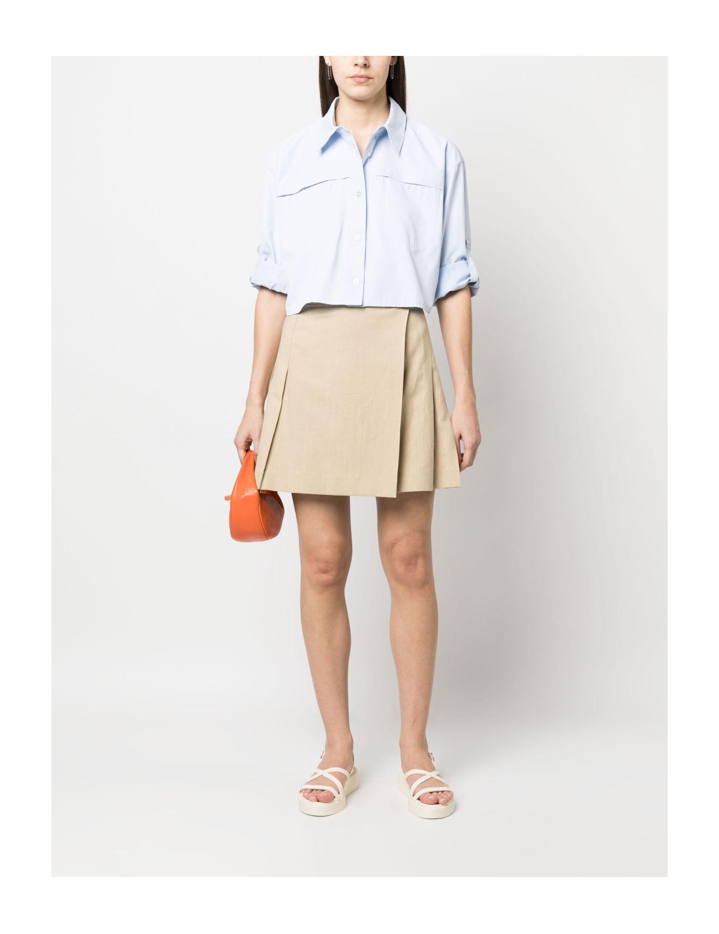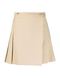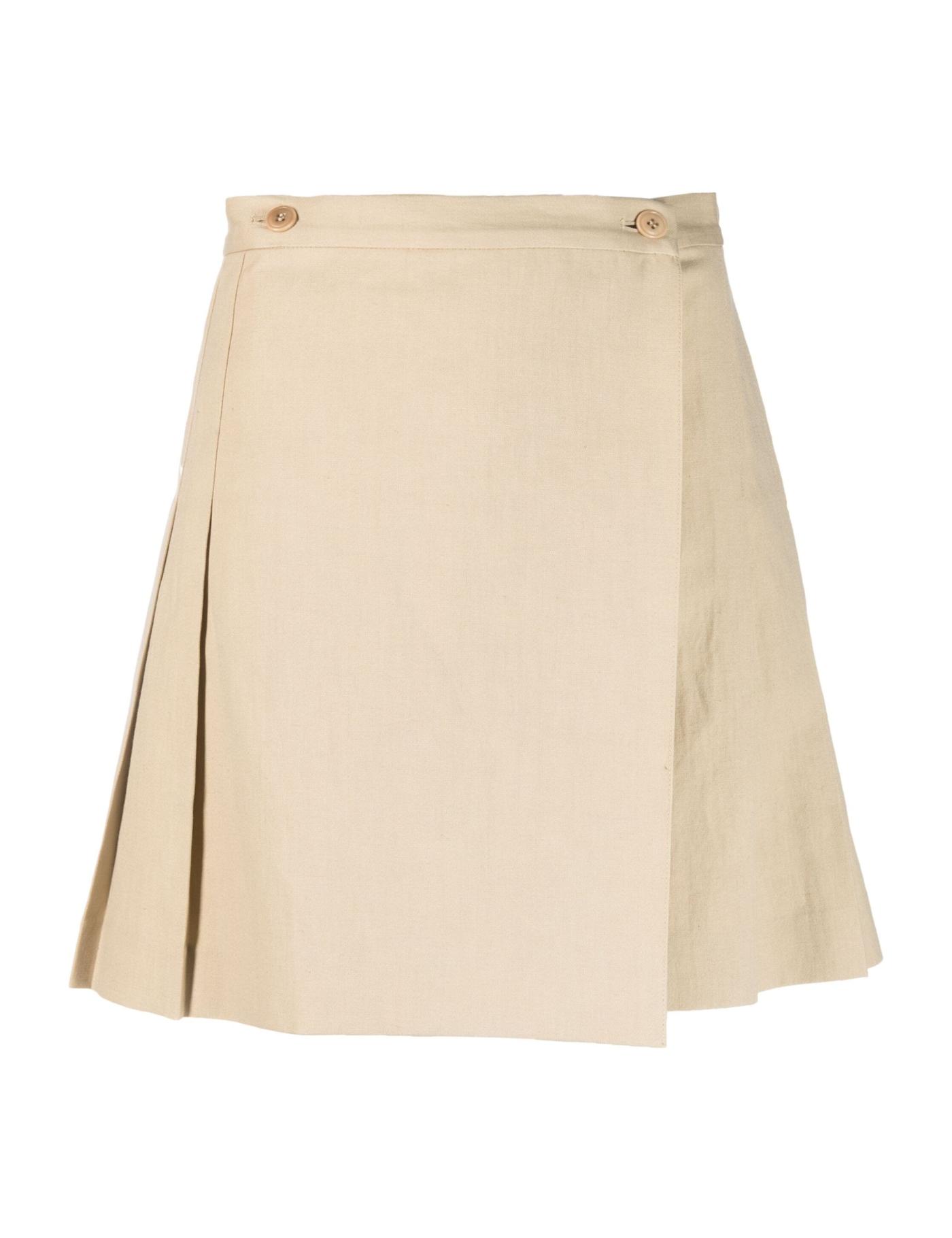 Riffing on tennis styles, Kenzo's wrap miniskirt features box pleats that define the flared A-line silhouette. Notice the contrasting red logo patch at the rear that's accented against the beige background.