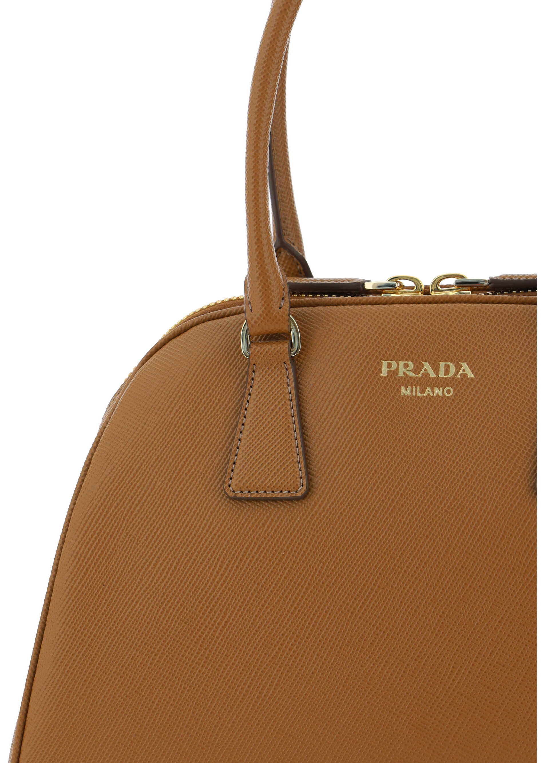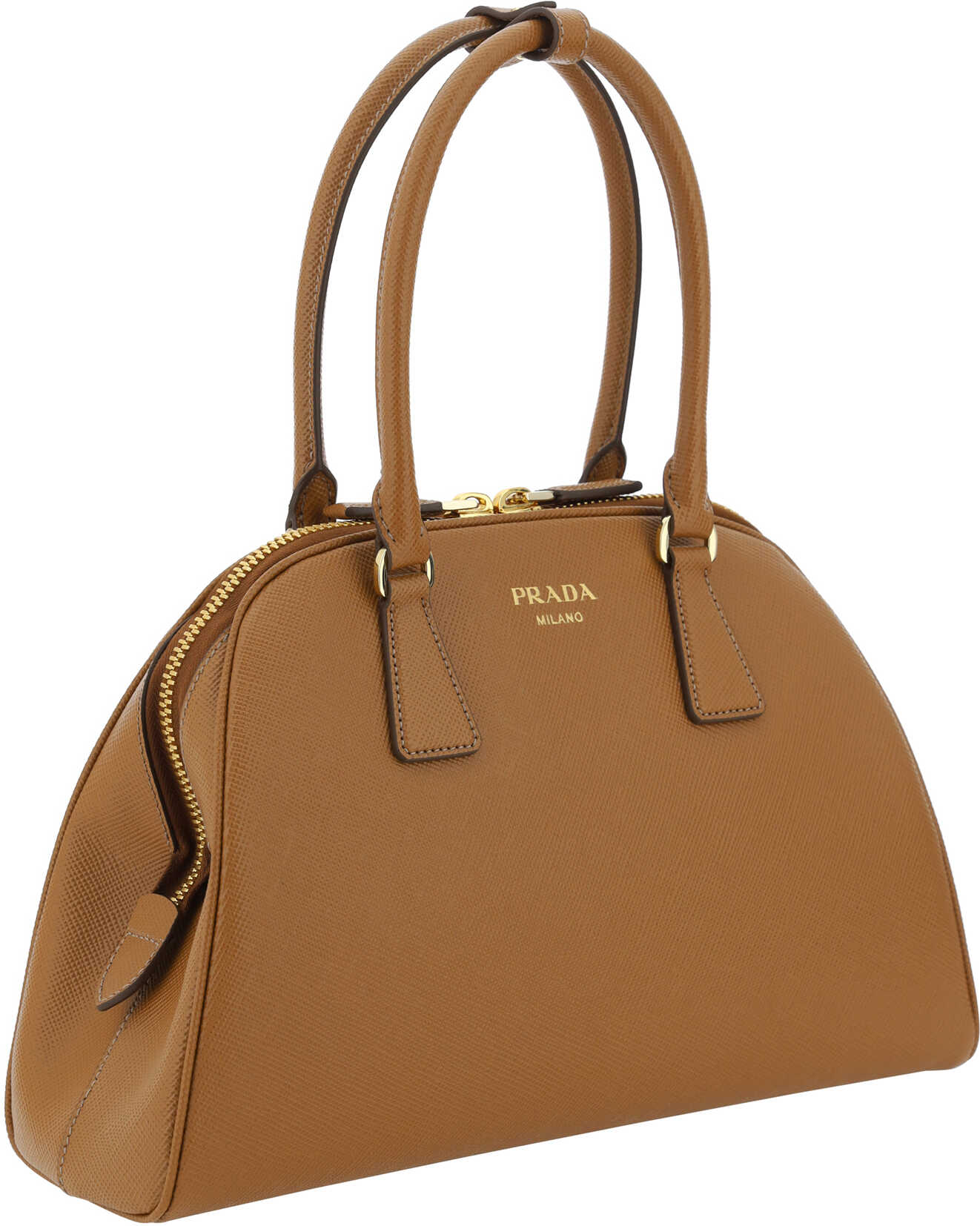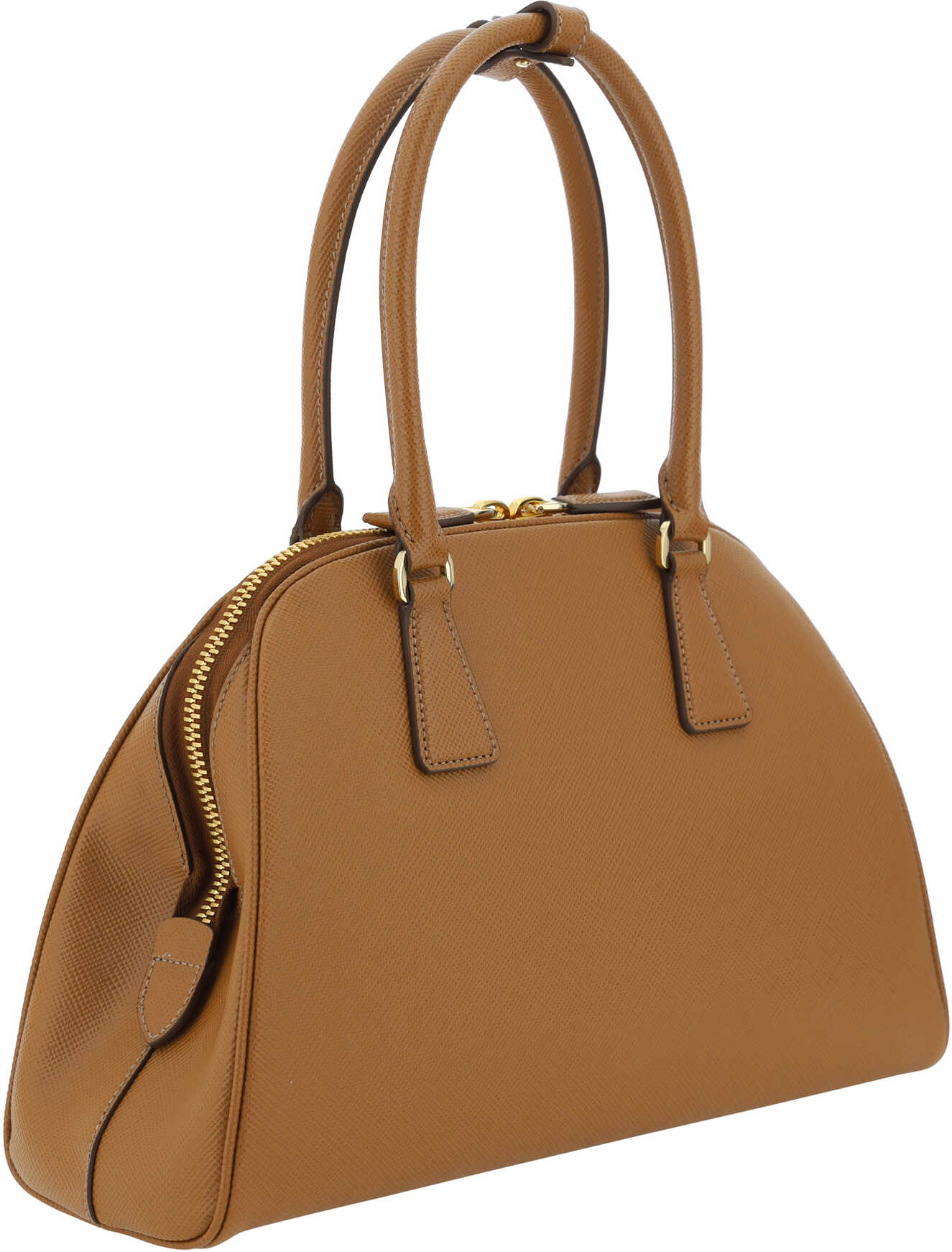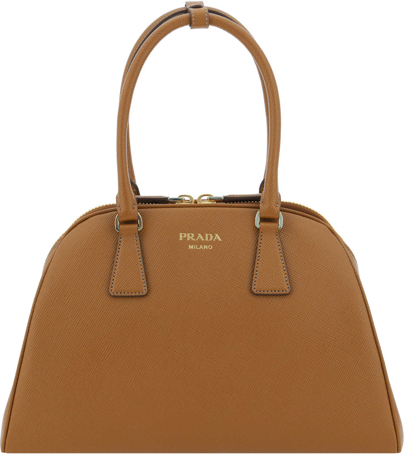 Saffiano Leather Shopping Shoulder Bag by Prada, double-slider zipper closure at top, two rigid tubular handles, single interior compartment, iconic enameled triangular brand signature plaque applied to front, geometric design, single interior compartment, slit pocket with zipper for interior closure.