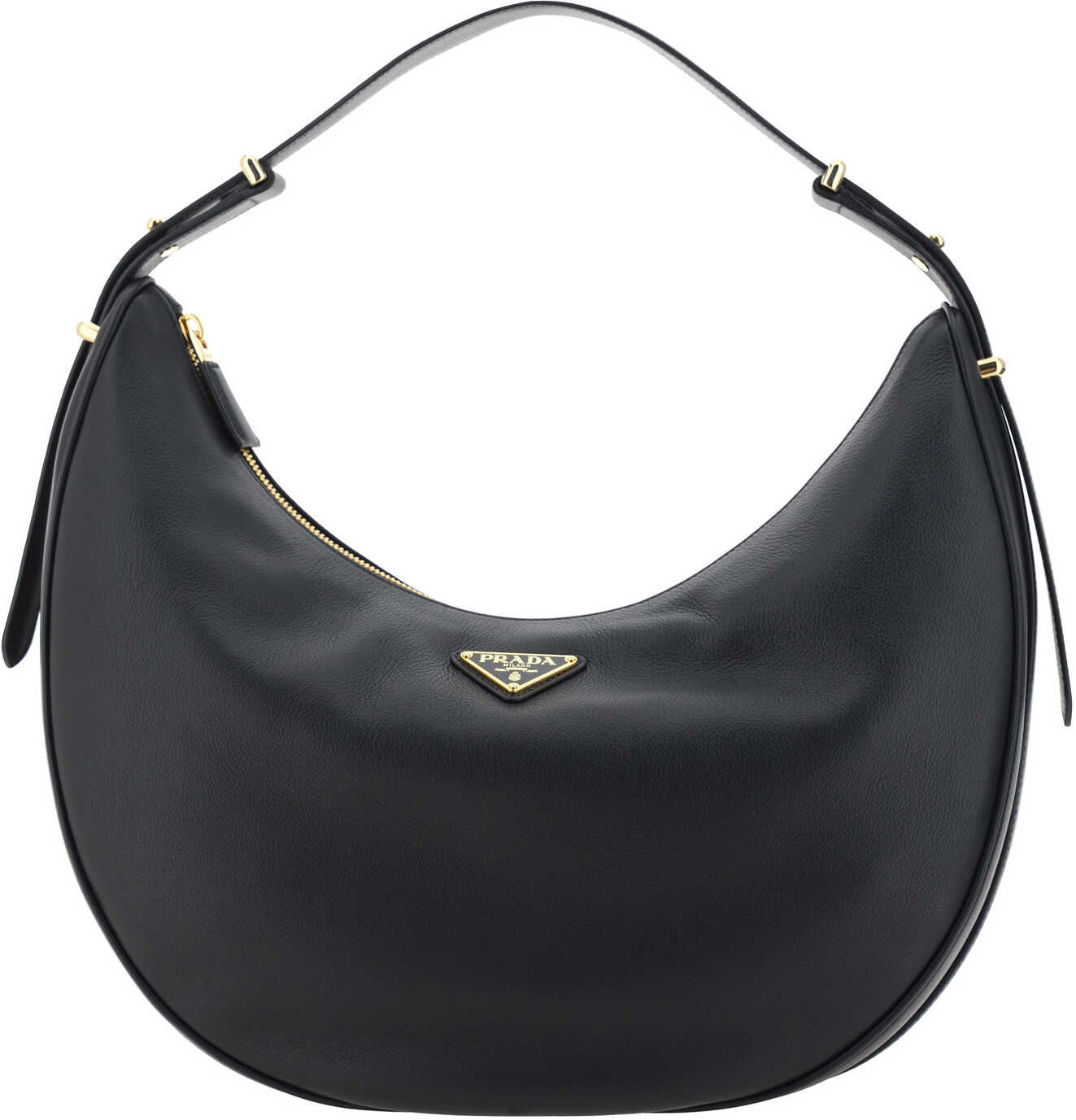Calfskin Arqué Handbag by Prada, featuring a hobo style, a top zipper closure, an adjustable flat handle, an adjustable and removable shoulder strap, and an iconic enameled triangular brand signature plaque applied to the front panel.