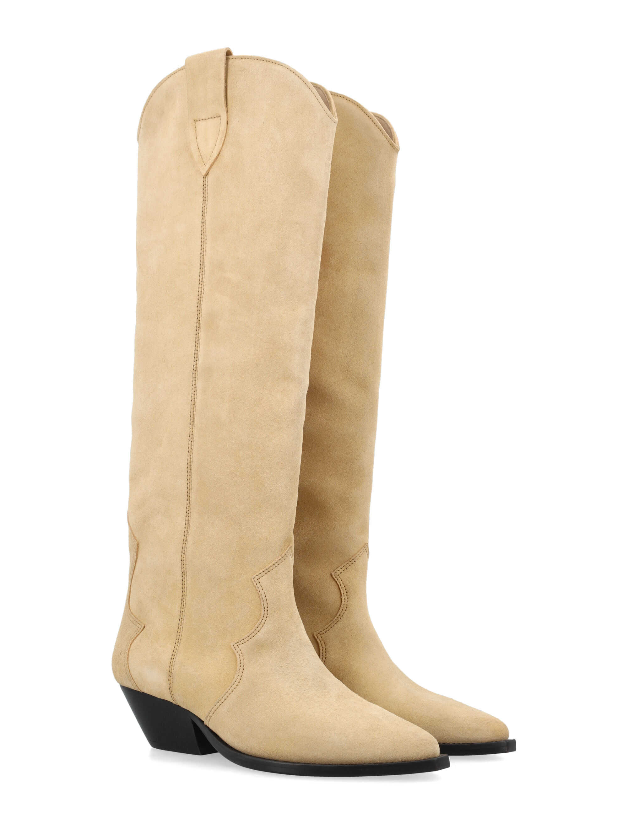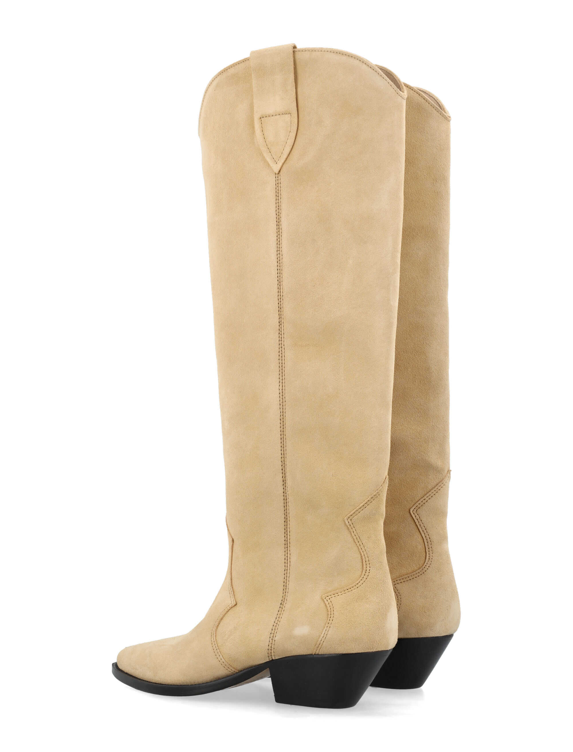 Step out in style with these stunning Denvee suede boots by Isabel Marant. Crafted from 100% velvet calf leather, these knee-high boots feature a classic cowboy boot design with a pointed toe and low stacked heel. The pull-on style with tabs and tonal stitching details add a touch of elegance to your look. Perfect for any occasion, these BEIGE boots are a must-have for any fashion-forward woman.