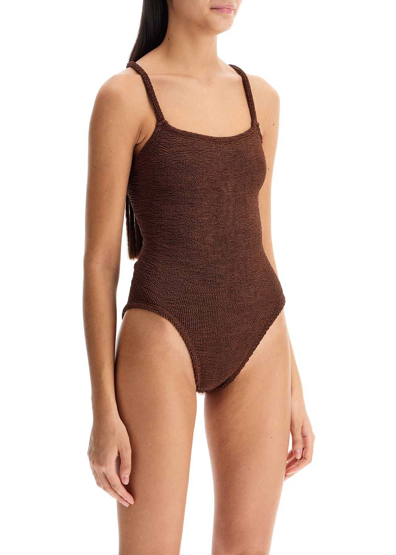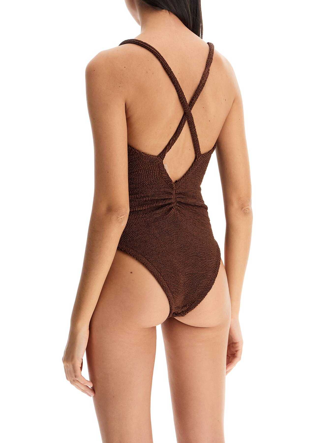 The Hunza G one-piece swimsuit is made of super stretch ruched fabric with criss-cross straps on the back. Unlined and available in one size.