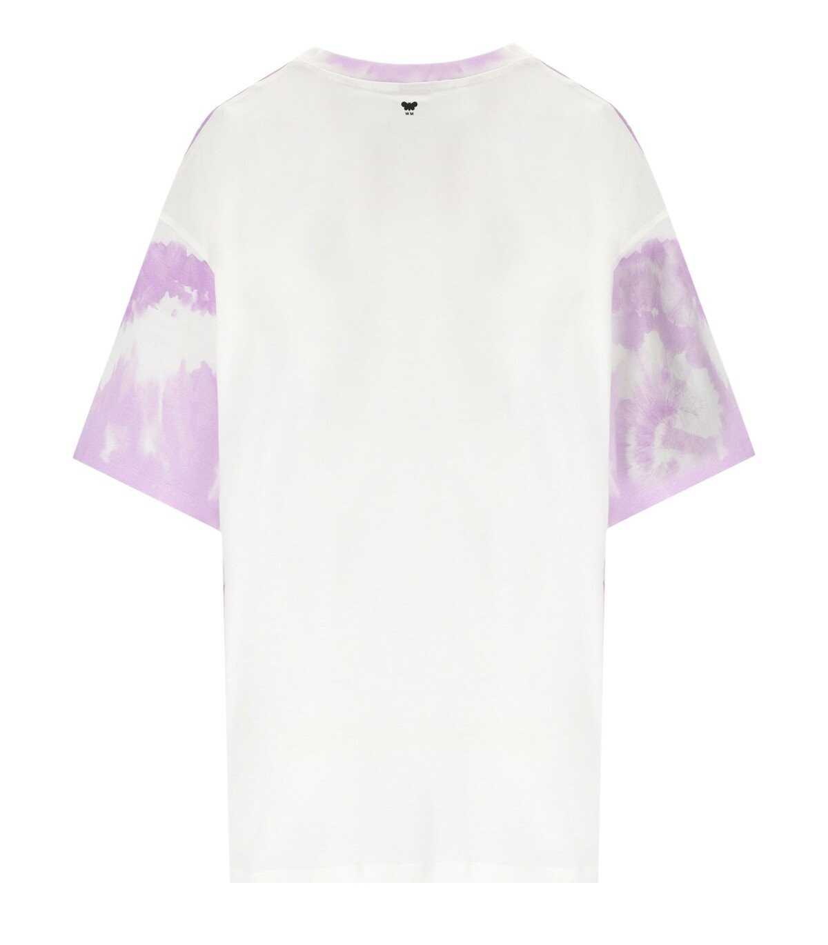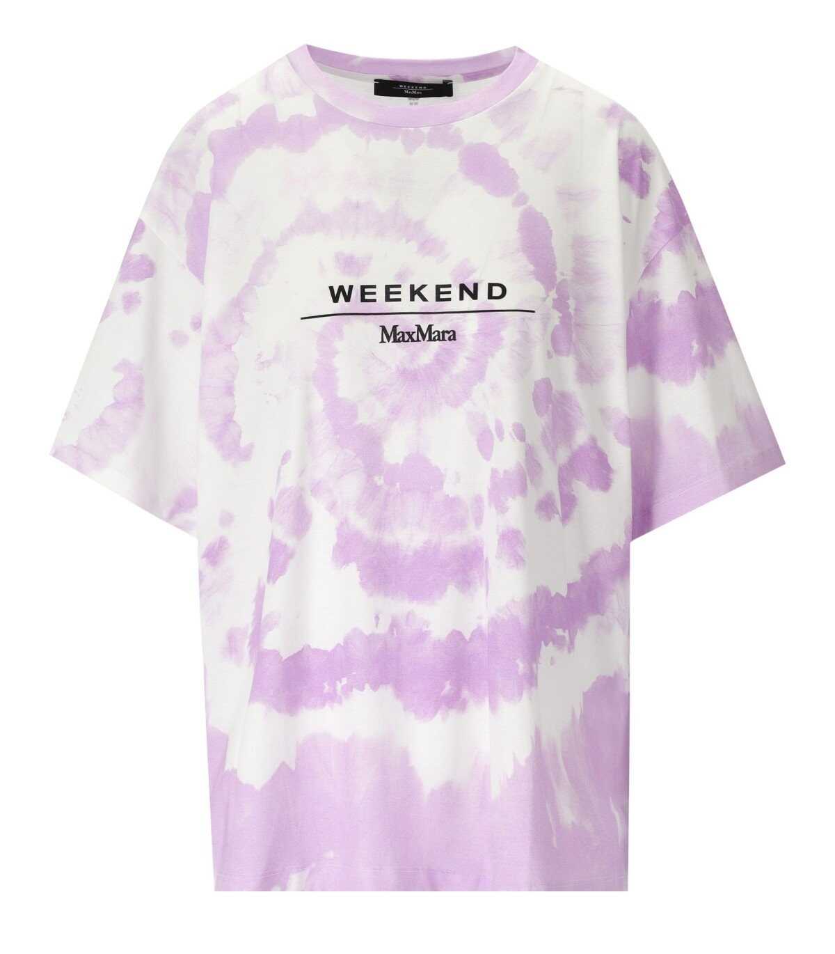 Xanadu t-shirt by Max Mara Weekend made of tie-dye effect cotton in shades of lilac and white. Characterized by a classic crew neck, it features a printed lettering logo on the front, 'Max Mara Weekend,' in black. Adorned with a playful spotted pattern. Oversized fit.