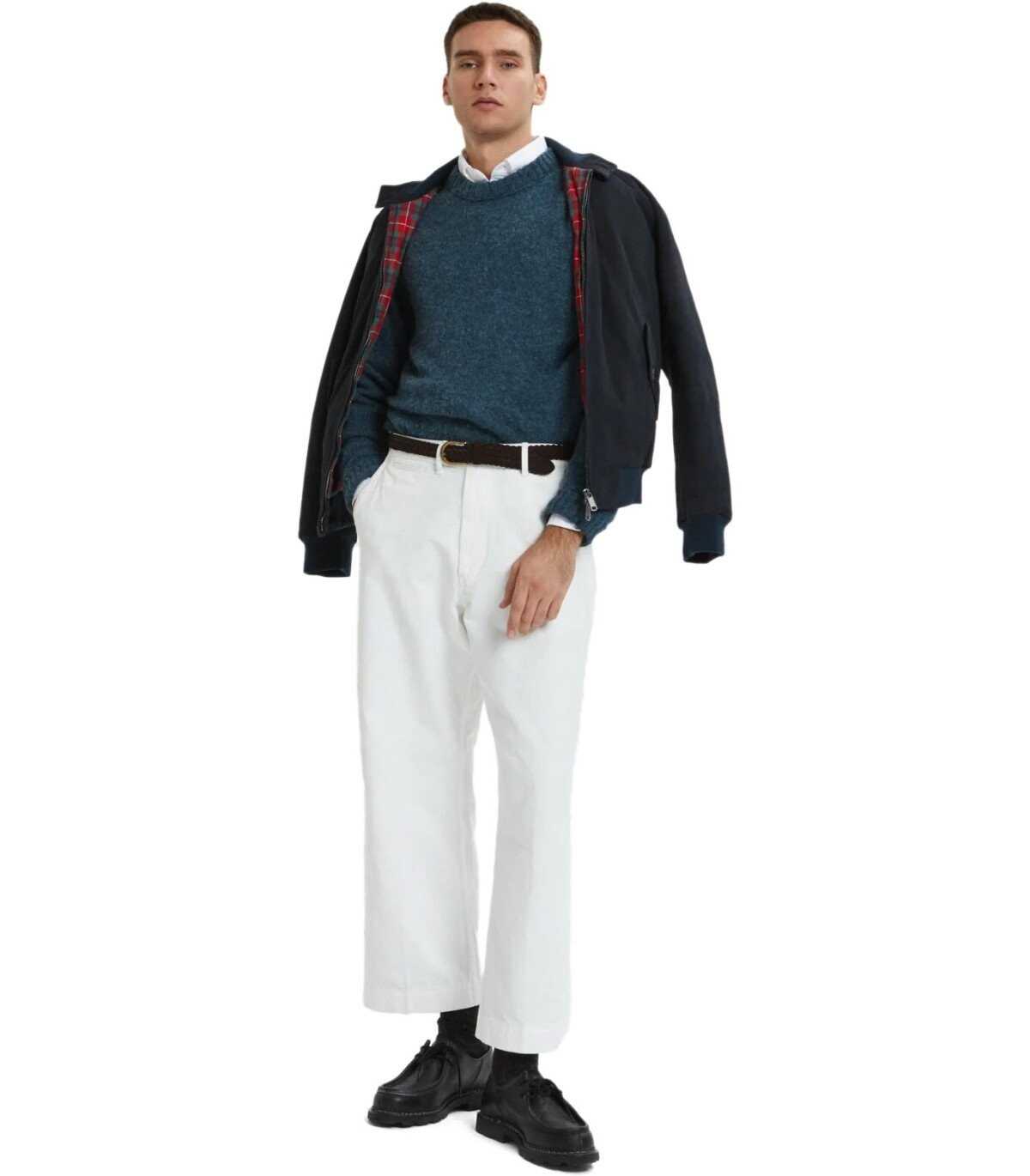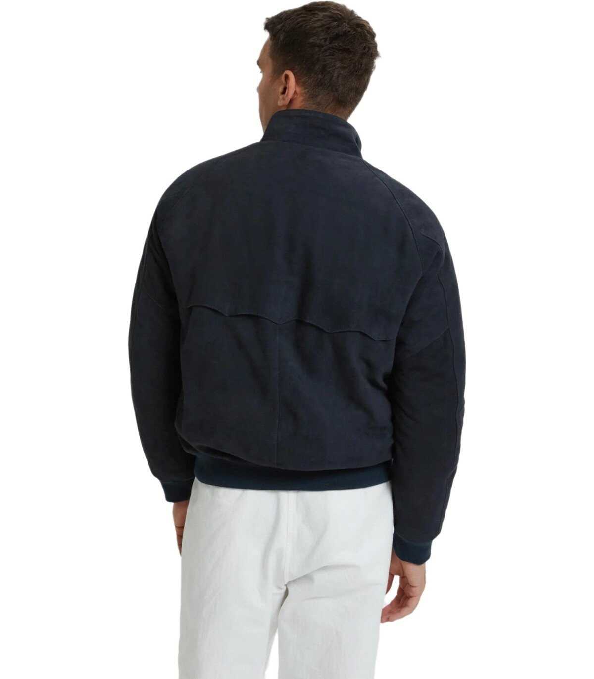 G9 Bomber jacket by Baracuta made of suede leather, padded, in navy blue. Characterized by a branded double-slider zip closure, it features raglan sleeves finished with ribbed cuffs. Equipped with a stand-up collar, with a thin ribbed interior, adorned with a two-button closure. It has front pockets with flap and button closure. Shoulder finished with an umbrella pattern. Internally lined with breathable cotton Fraser Tartan fabric. Drawstring at the waist, ribbed. Regular fit.