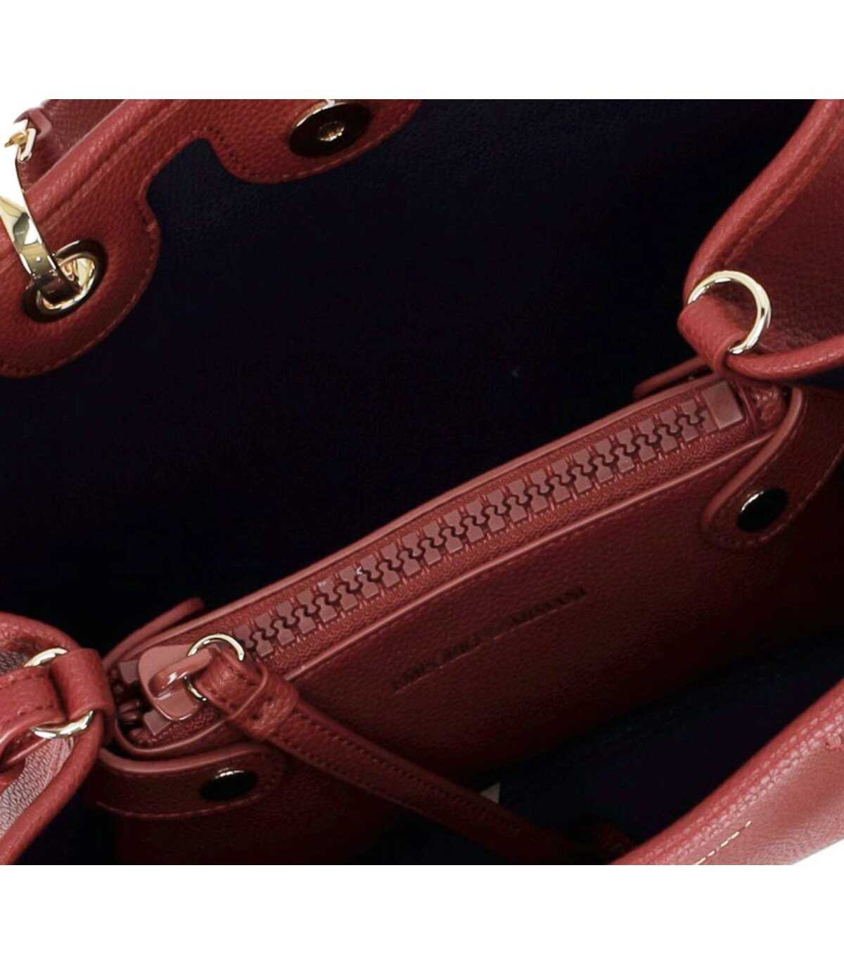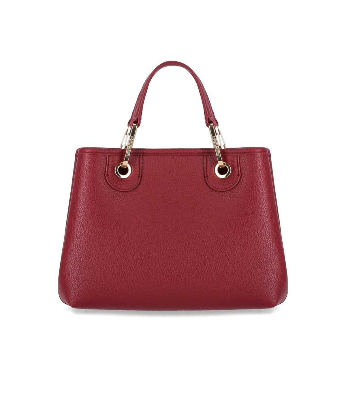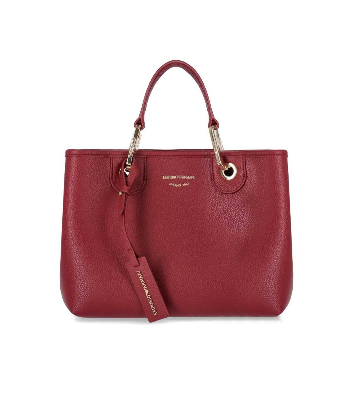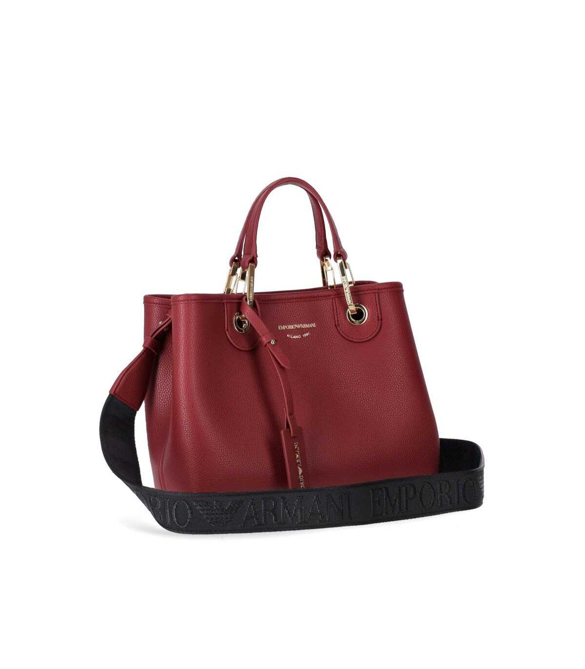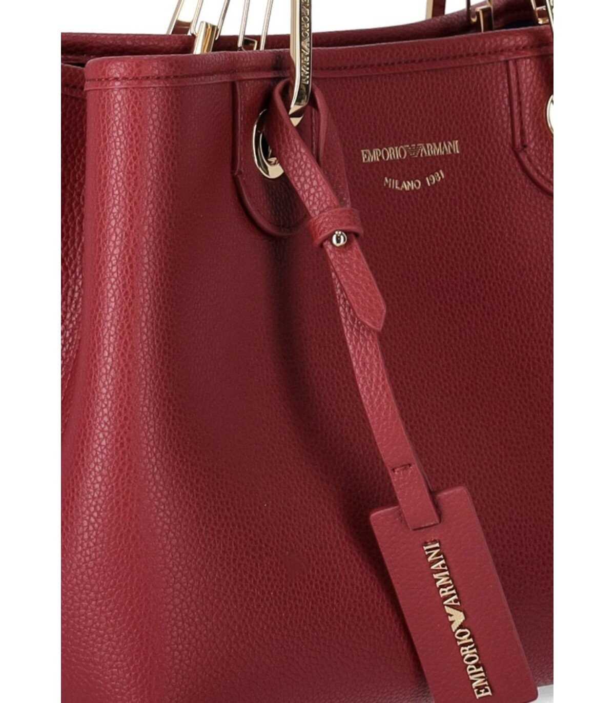 Shopping bag from the MyEA line of Emporio Armani, made of technical fabric in a bordeaux color. Characterized by a magnetic closure and screen-printed logo, it is finished with deer print. Equipped with double handles, it has golden metal logoed carabiners. Removable and adjustable shoulder strap, logoed. Internally lined, it features two open compartments, with a matching zippered pouch. Dimensions: 26x20x10 cm.