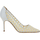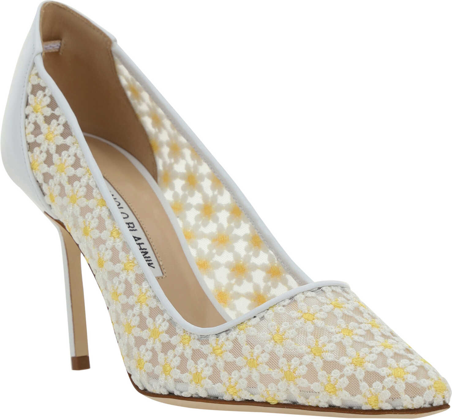 Silk Satin Bbla Tora Pumps by Manolo Blahnik, almond toe front, leather stiletto heel, floral lace effect upper design, reinforced leather label at heel, logoed insole.