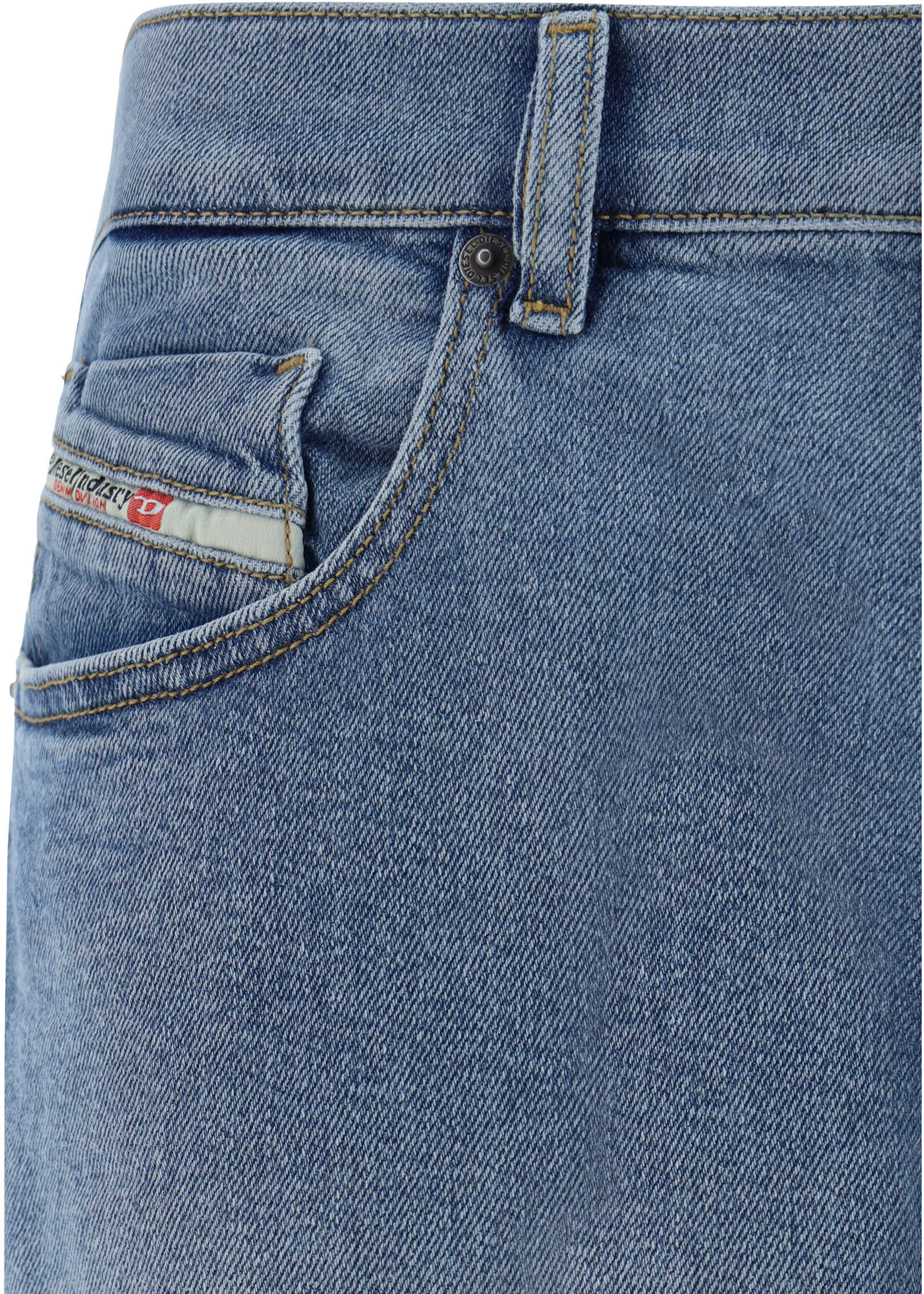 Cotton 2019 D-Strukt Jeans by Diesel, five-pocket straight style, front button and zipper closure, belt loops waistband, iconic leather patch with brand signature pressure-printed applique on back.