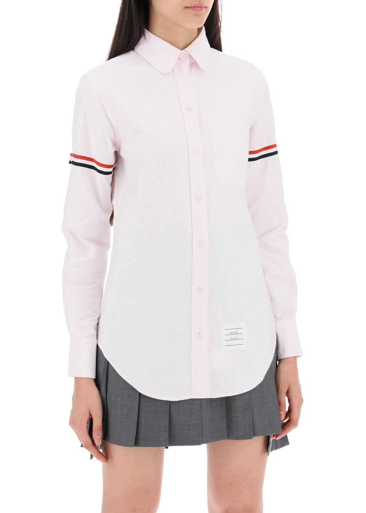 Thom Browne classic shirt in Oxford cotton featuring tricolor grosgrain inserts with adjustable tab on sleeves. Classic round collar with single button on the back, front closure with mother-of-pearl buttons, chest patch pocket, one-button cuffs and rounded hem. It features the iconic tricolour striped ribbon loop tab on the back of neck and the logo tag on front. Regular fit. The model is 177 cm tall and wears a size IT 38.