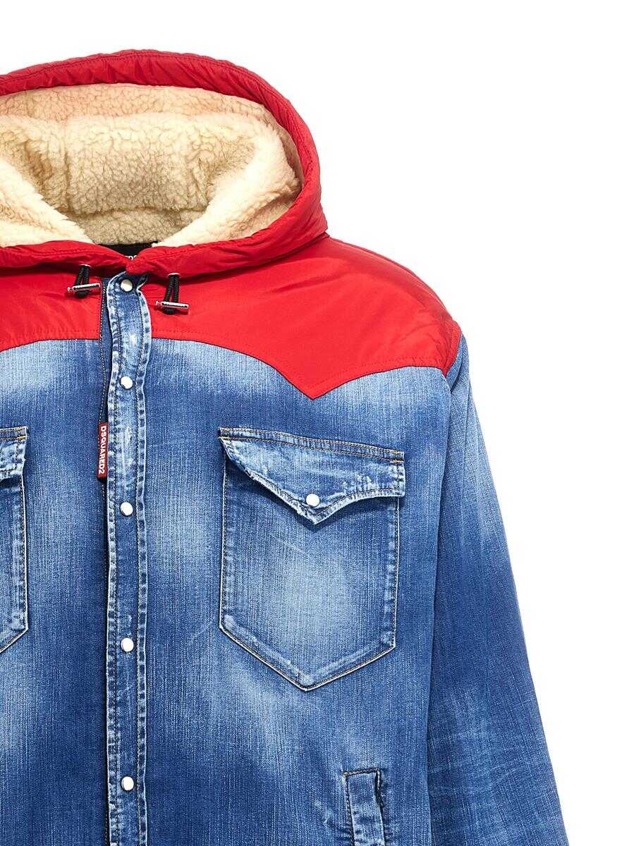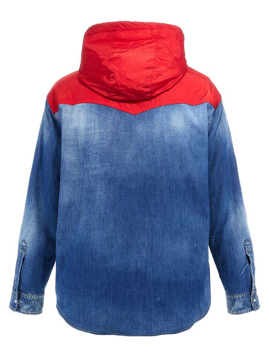 'Winter Western' cotton denim overshirt with nylon insert and hood, shearling lined interior, button closure, pockets, long cuffed sleeves