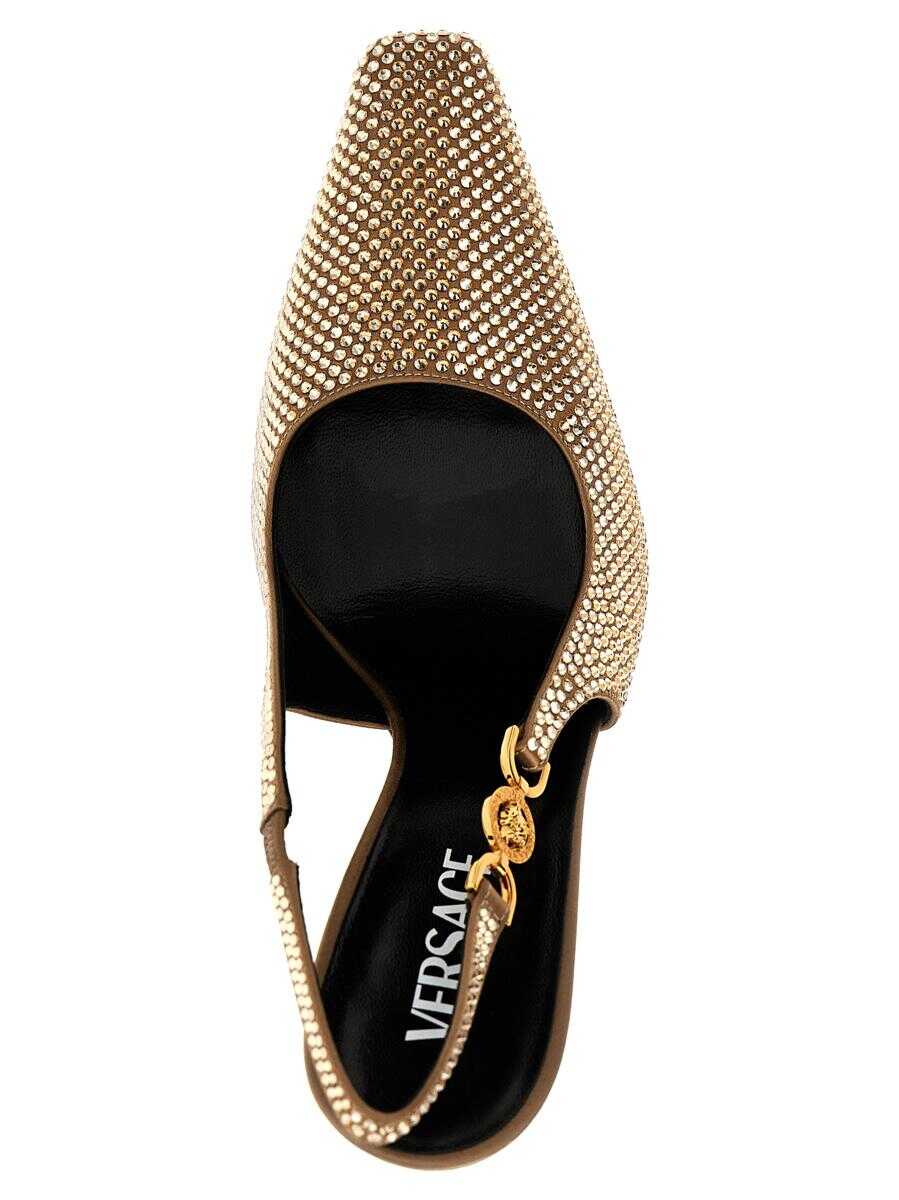 Satin slingback with rhinestone appliqué and 'Medusa '95' detail on the strap, heel