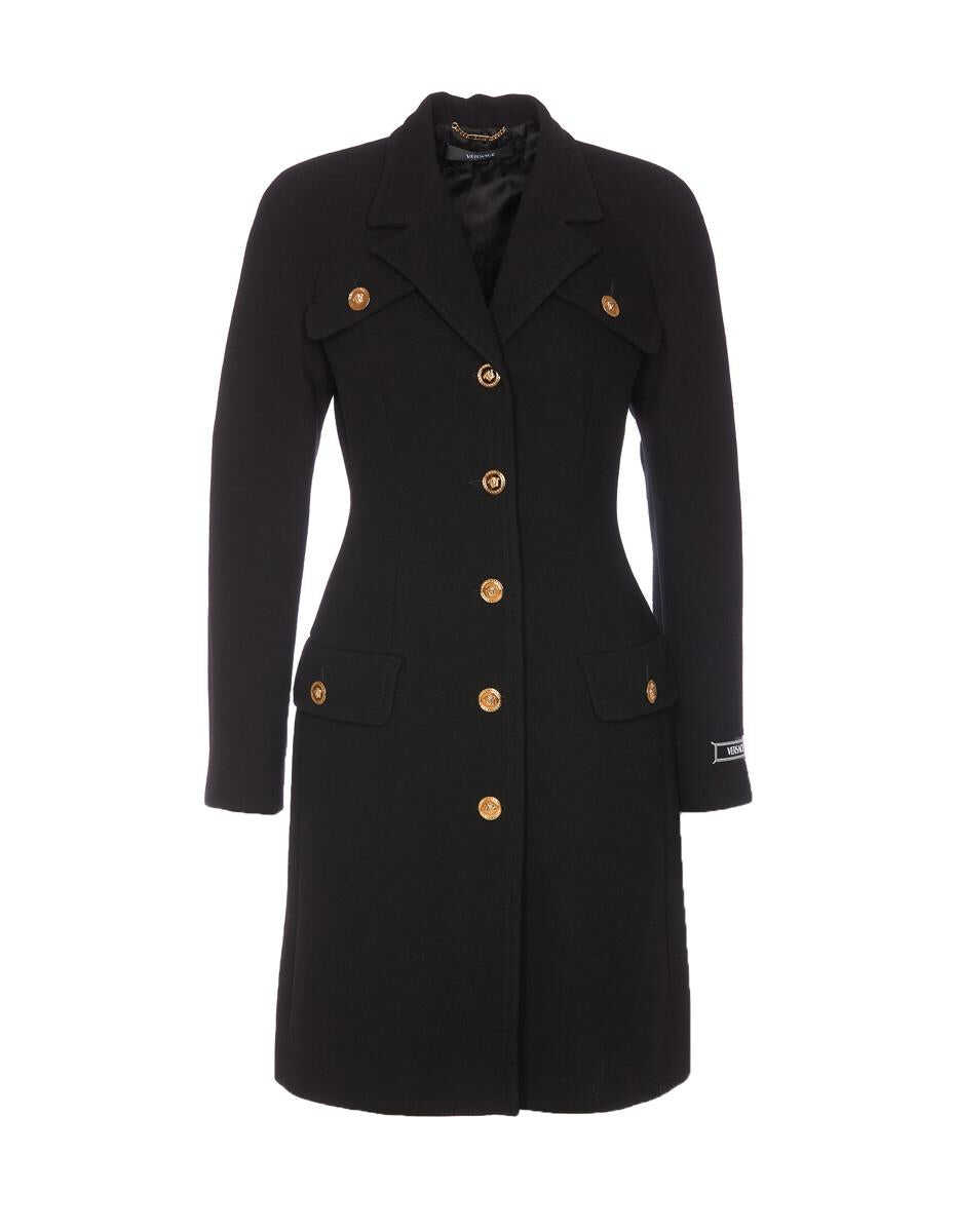 Versace Black Coat With Frontal Logo Buttons Closure, V-Neck, Reverse Detail, Long Slevees, Reinforced Shoulder, Patch On Sleeves, EU SIZE (IT)