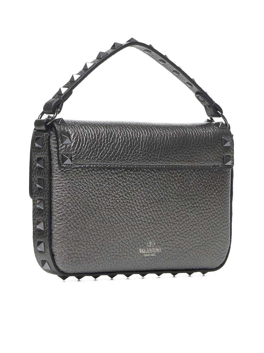 Valentino Garavani’s Rockstud mini bag in charcoal grey grained leather featuring iconic tone-on-tone metal studs along the handle, the detachable shoulder strap and edges, logo lettering printed on the back, concealed magnetic fastening and internal card slots. 180x130x30x1030mm Size Type: Unique