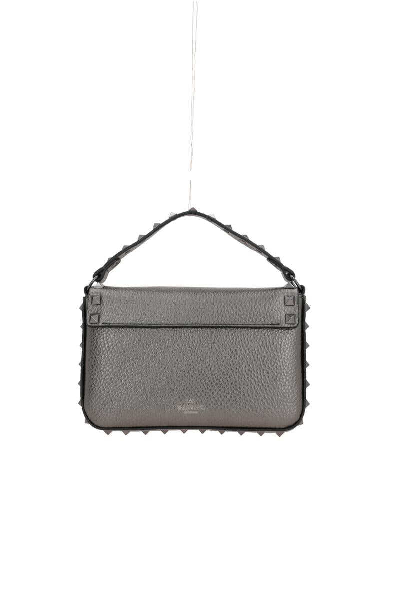 Valentino Garavani crossbody bag crafted in anthracite grey grained leather adorned with signature ruthenium-tone metal studs. Featuring magnetic button closure on flap, top handle and removable strap. Black leather-lined interior with three card slots. The design is completed by the unmistakable logo embossed on the back.