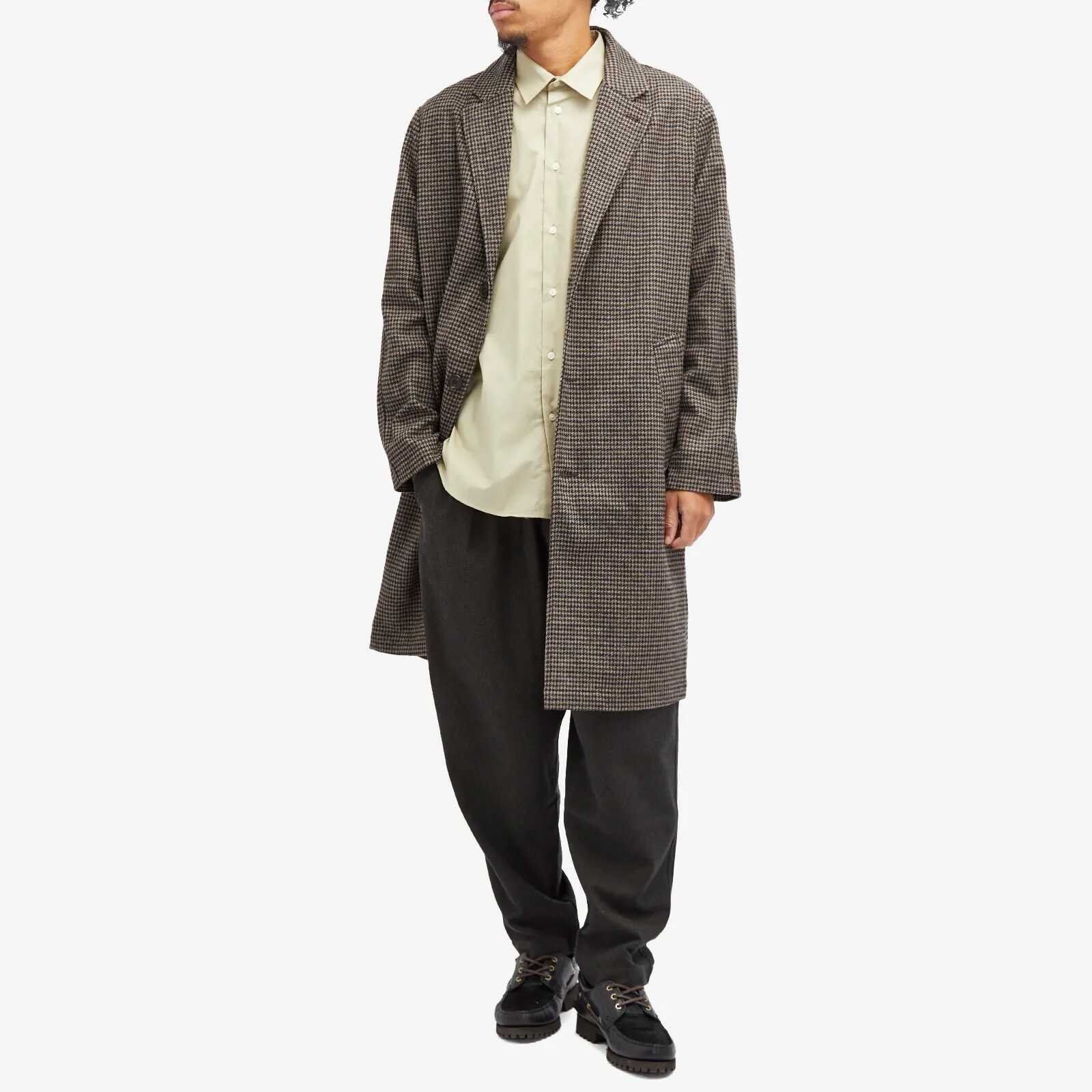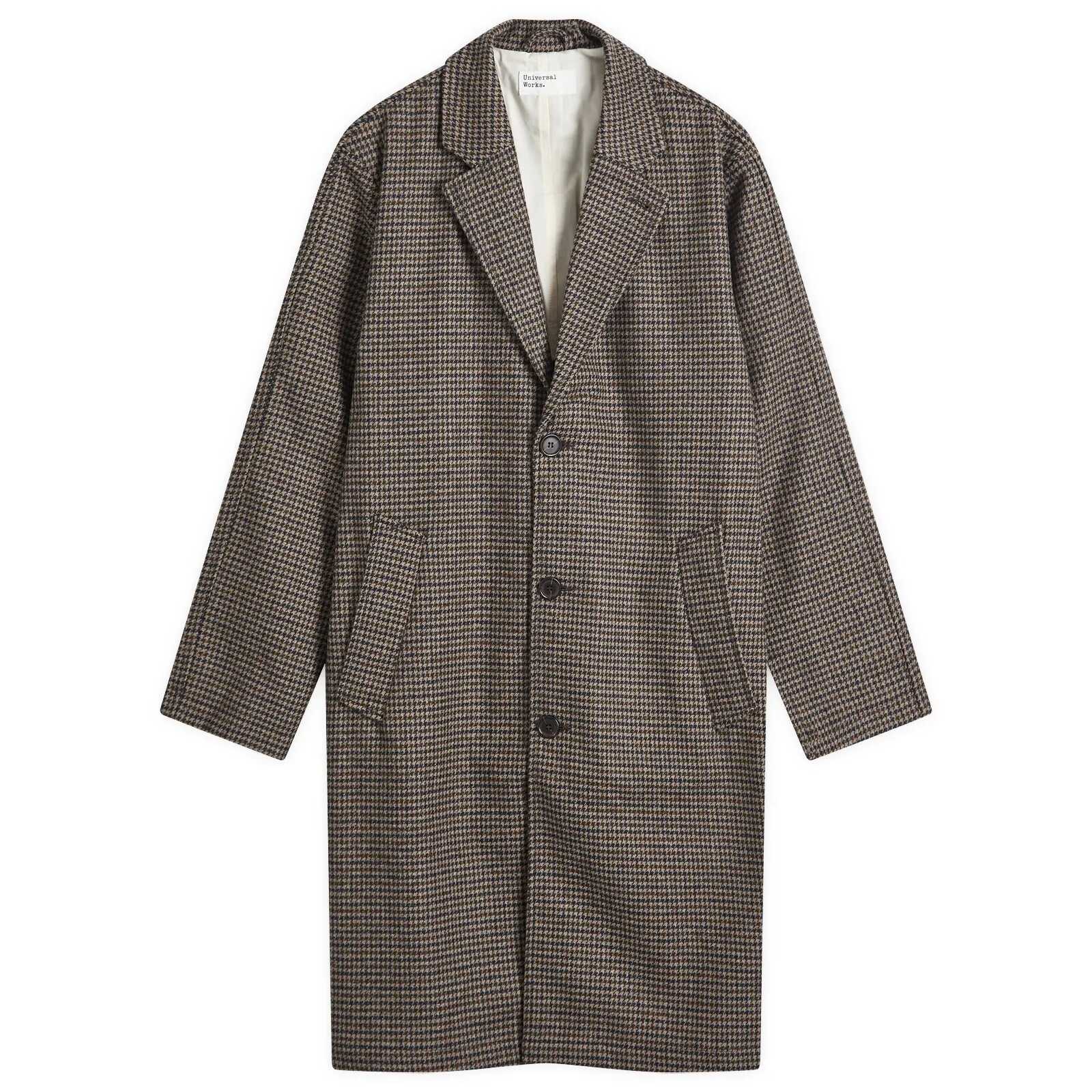 Universal Works overcoat lined with notched lapel, three-button closure, side flap pockets, and back vent.