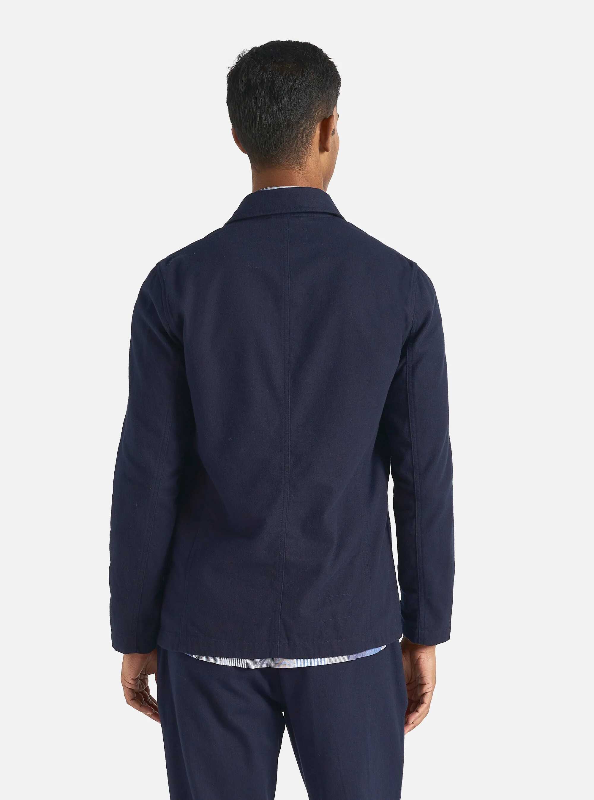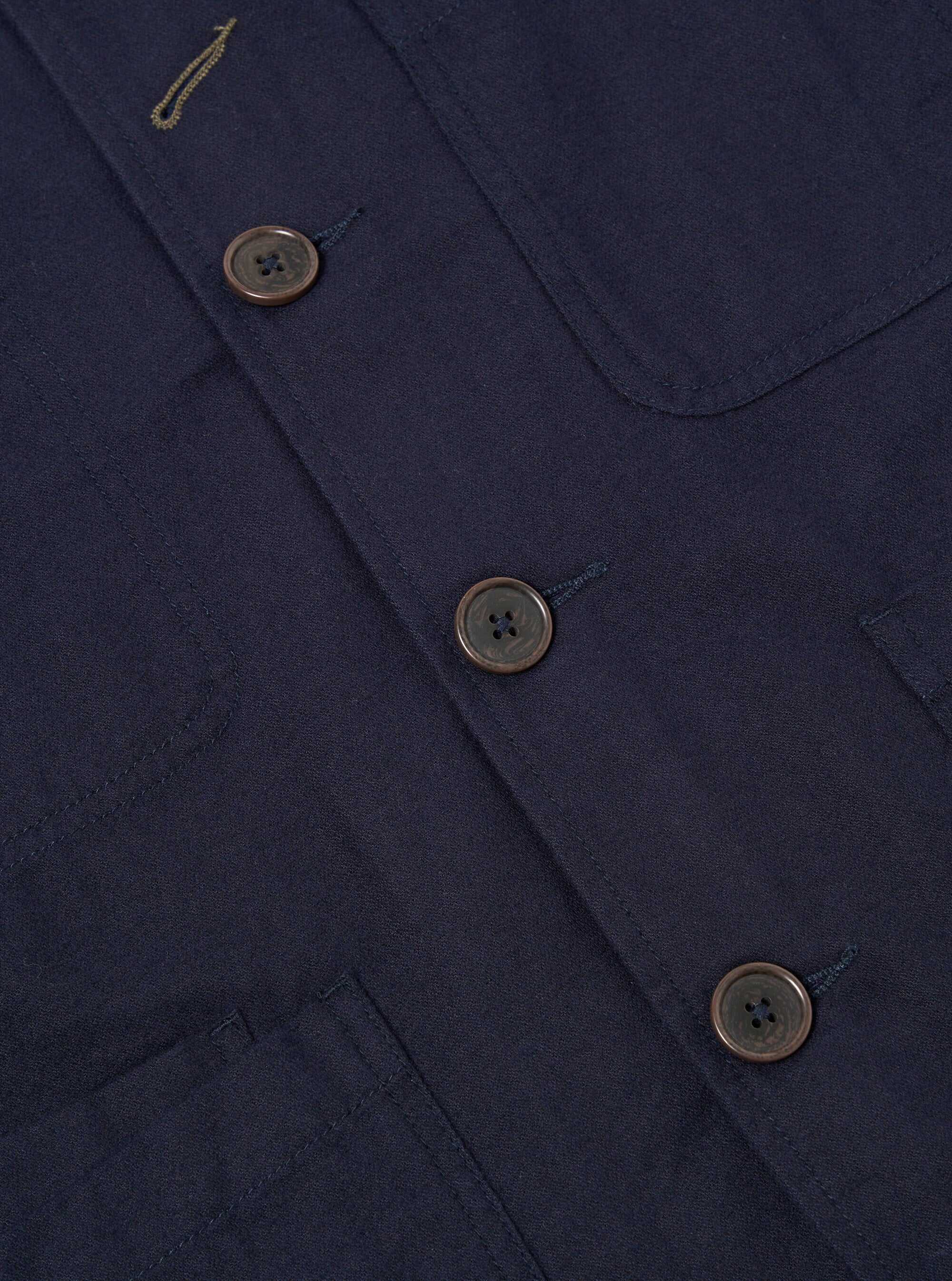 `Universal Works cotton jacket with front pockets, button closure, French collar.`