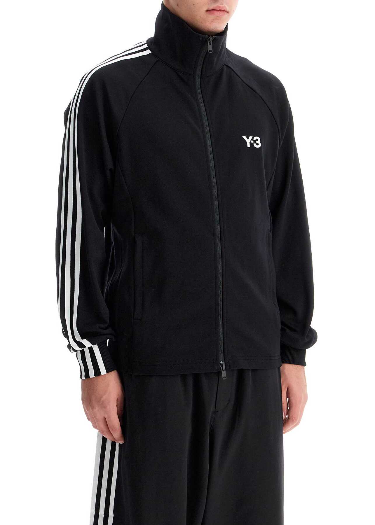 The Y-3 technical jersey track top is characterized by a soft cut with a high collar and raglan sleeves. Embellished with the iconic stripes on the right sleeve made of satin and the printed logo on the chest, the garment features a two-way zip closure, ribbed cuffs and hem, and side pockets with zips. The model is 182 cm tall and wears size M.