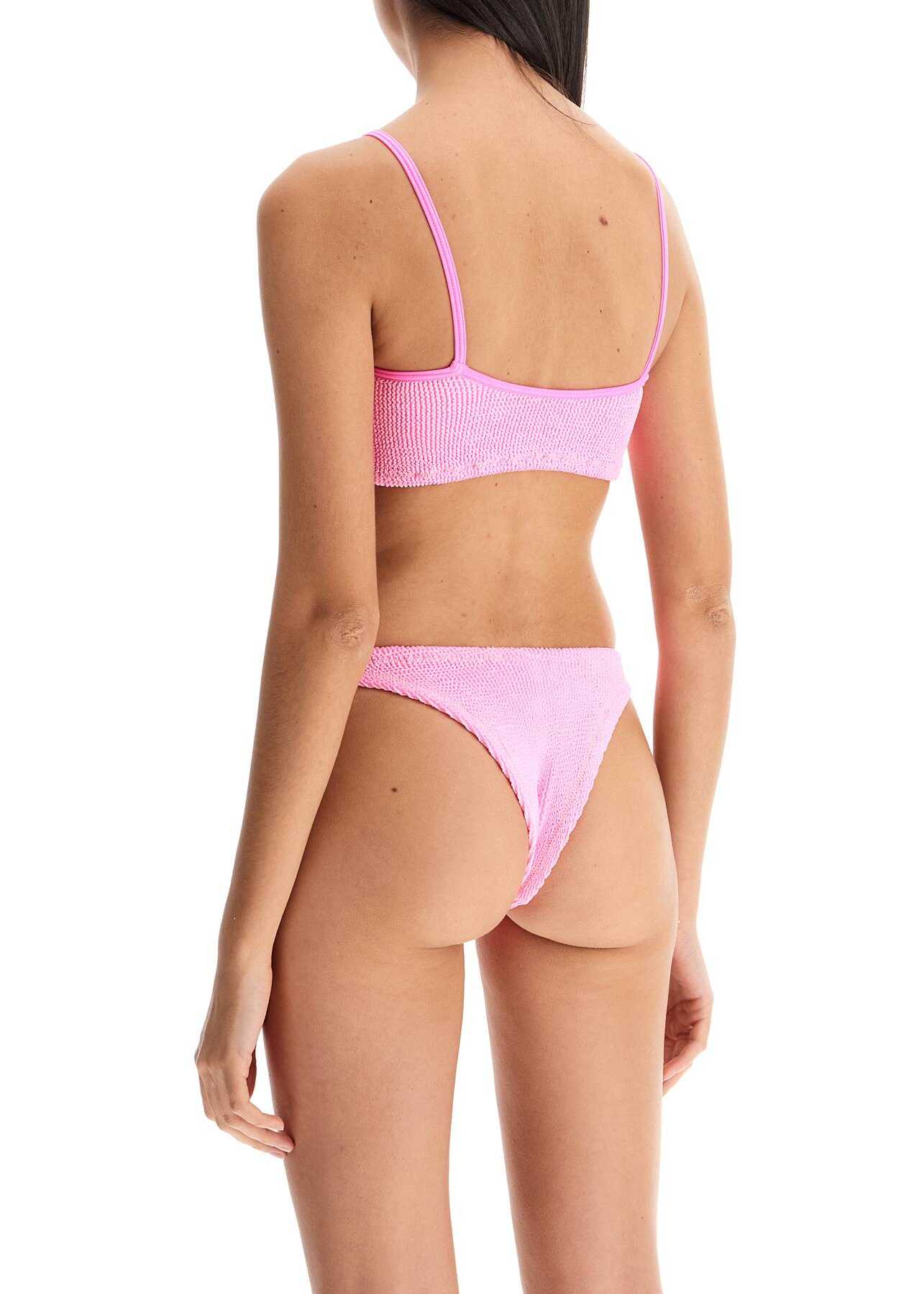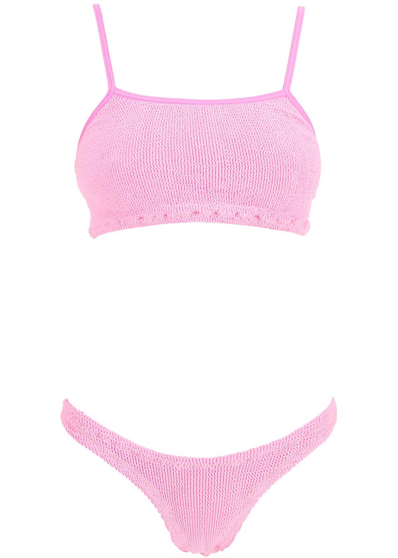The Ginny Spaghetti Bikini by Reina Olga is made of embossed stretch fabric and features a bandeau top with thin straps and high-cut bottoms. The model is 177 cm tall and wears a one-size-fits-all.