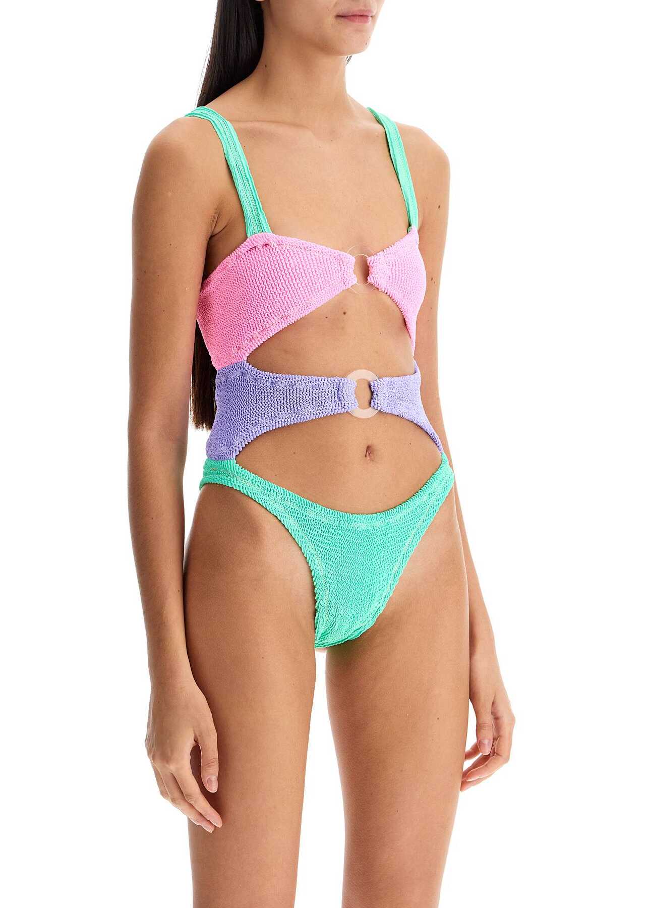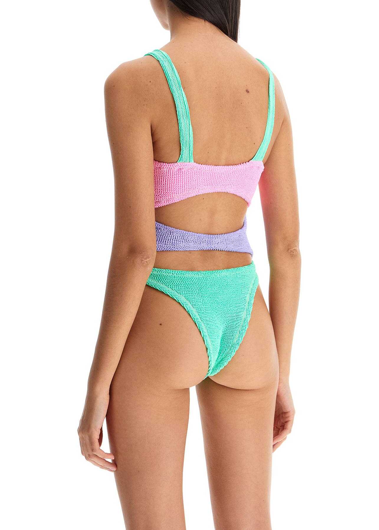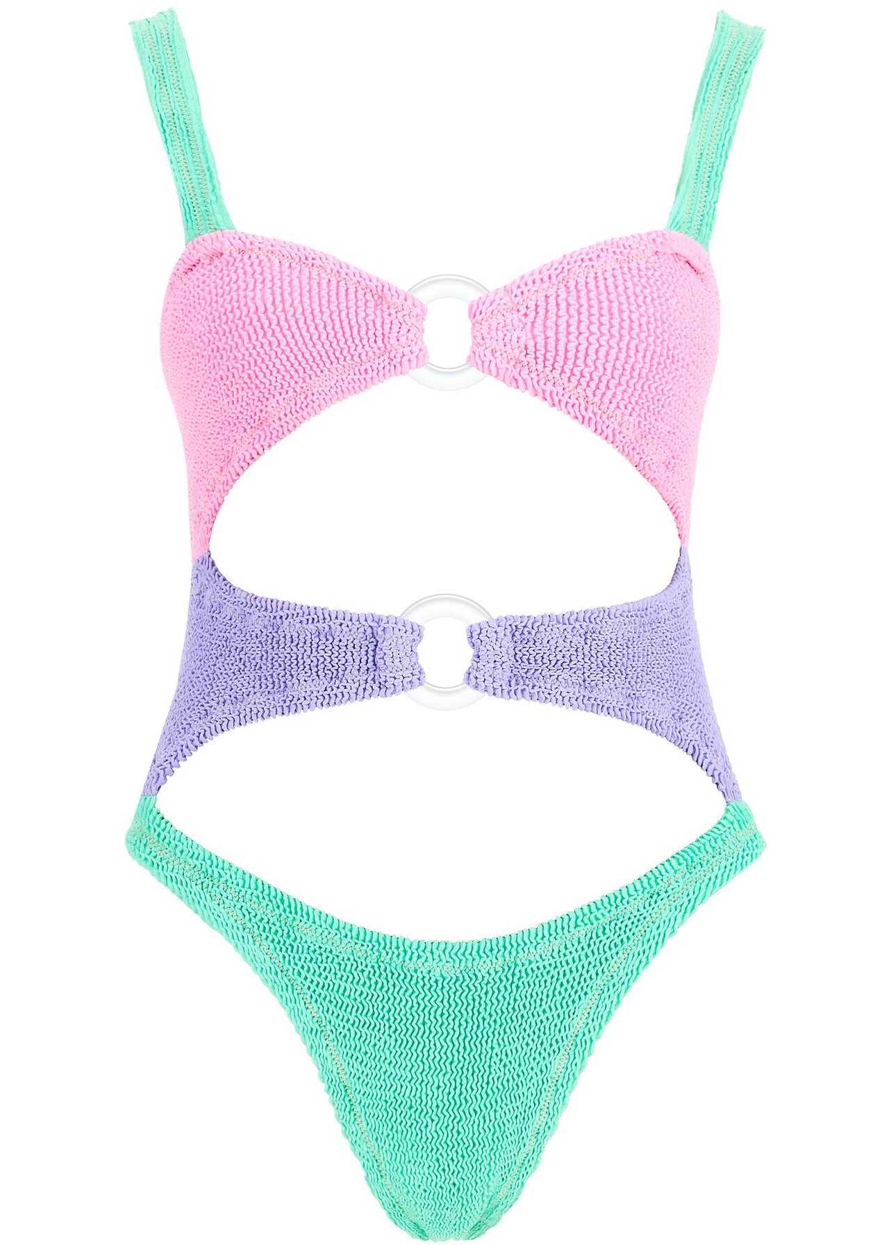 Made with the classic embossed stretch fabric, this one-piece swimsuit by Reina Olga stands out for its cut-out and color-block design with transparent front rings. Finished with lurex stitching, it features a sweetheart neckline and high-cut bottoms. The model is 177 cm tall and wears a one-size-fits-all.