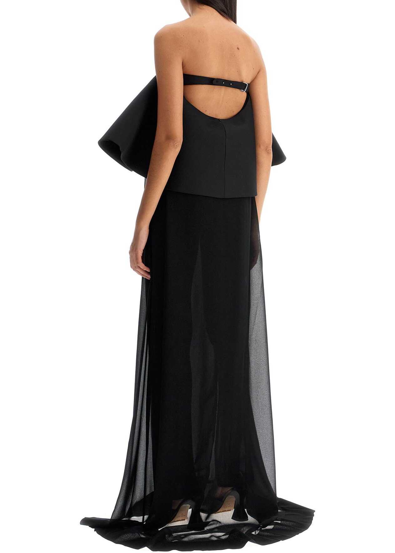 This Jacquemus maxi dress features a wide and flared silhouette, made of chiffon with a structured oversized ruffle in wool and silk. Supported by an internal boned bustier, the dress has a straight strapless neckline and an adjustable strap at the back. It closes with an invisible zip at the back and is lined with stretch tulle. The model is 177 cm tall and wears size FR 36.