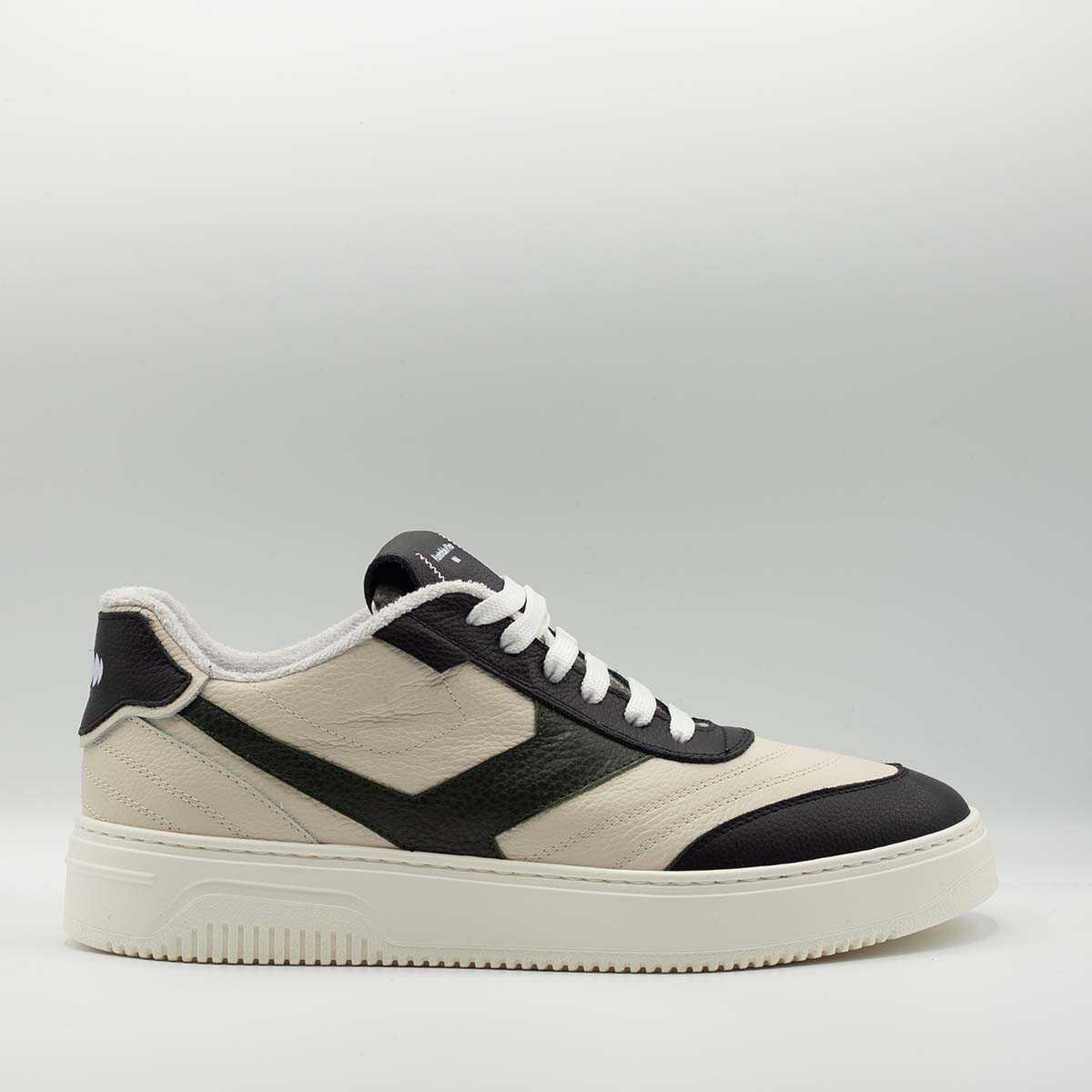 Step up your sneaker game with our Pantofola D'oro Crossball Men's Sneaker in White. Expertly crafted in soft Italian leather, these retro-inspired sneakers will elevate any outfit. With black, dark green, and cream/white contrast leather uppers, side-panel detailing, and a logo on the heel, these lace-up design sneakers are modern yet classic. The durable rubber sole ensures they're perfect for any activity. Made in Italy, these sneakers are the epitome of class and style. Shop now and step out in style!
