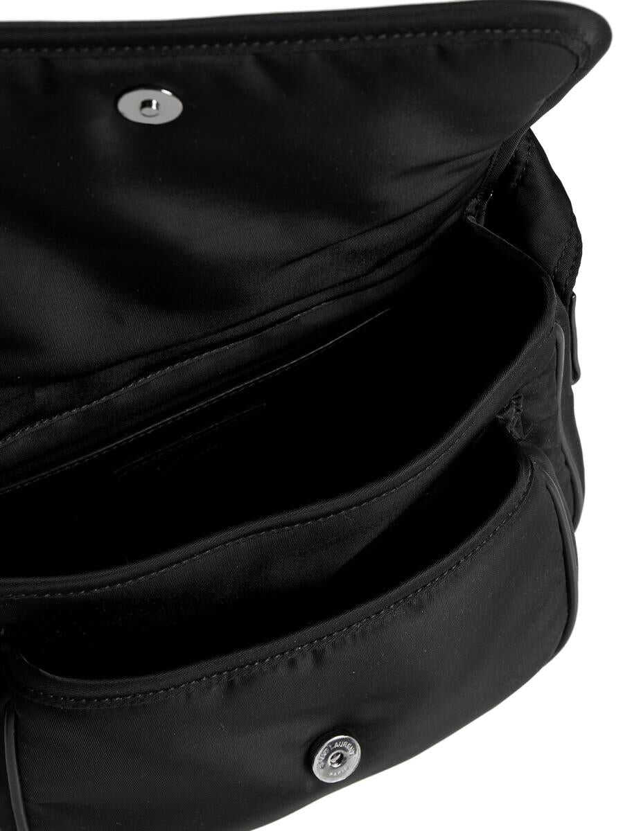 Saint Laurent’s Niki messenger small bag in black nylon featuring an adjustable shoulder strap, tone-on-tone YSL logo plaque on the lapel, leather details with embossed logo on the sides, concealed magnetic fastening, front pocket, internal flat pocket and silver-tone metal hardware.