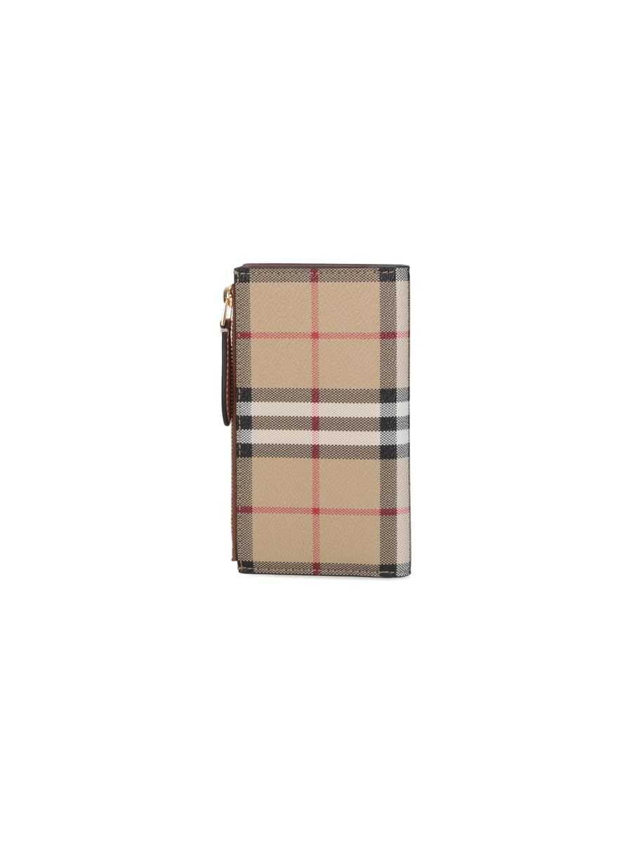 Vintage Check-pattern bi-fold wallet from BURBERRY featuring archive beige, grained texture, Vintage Check pattern, contrast stitching, gold-tone hardware, bi-fold design, rectangle shape, press-stud fastening, zip-fastening pocket and internal card slots.