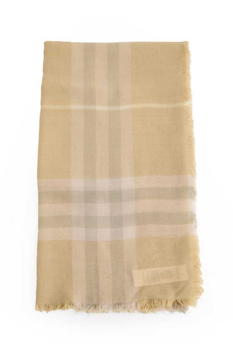 beige wool fine knit Vintage Check pattern fringe detailing appliqué logo wraparound style