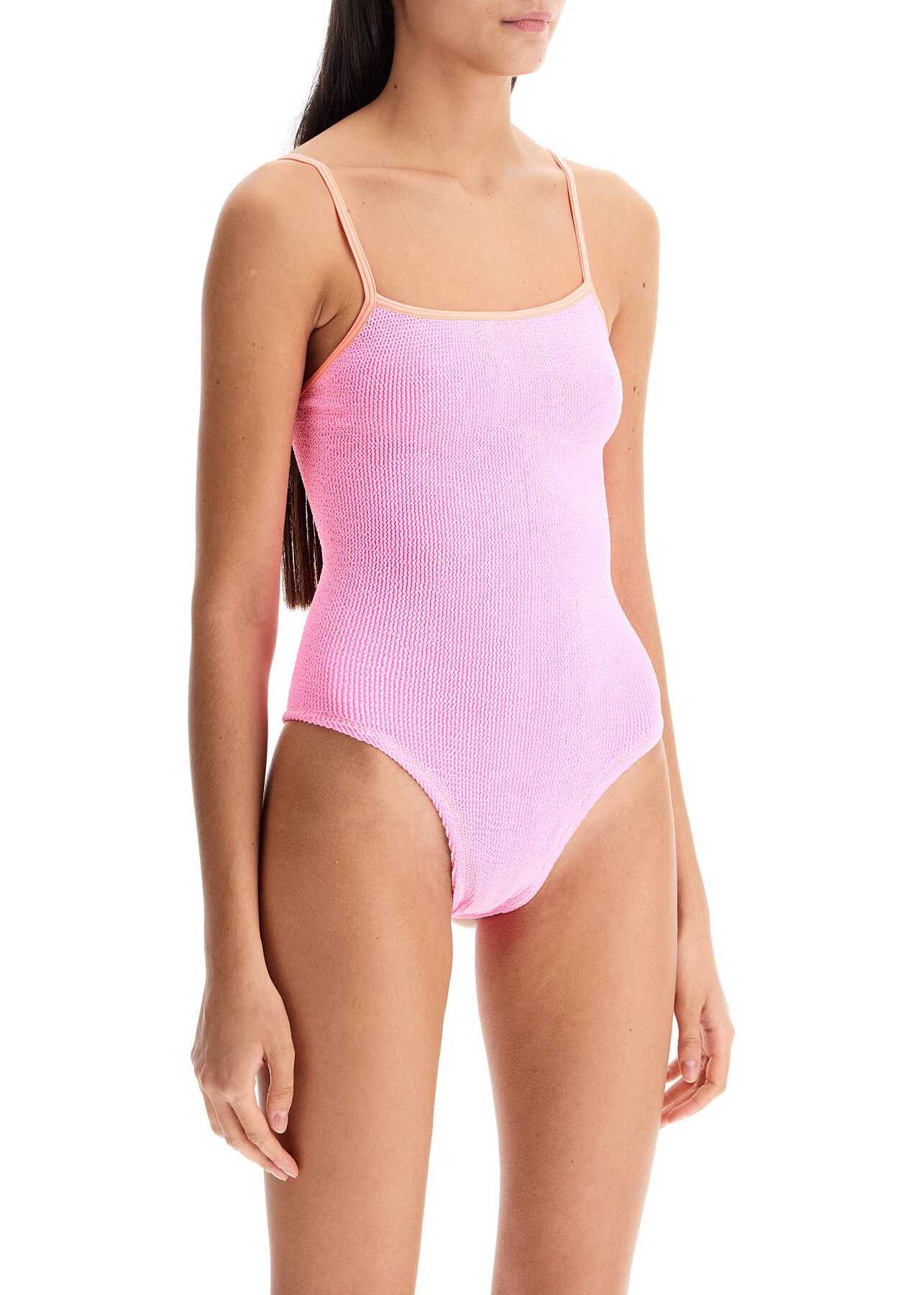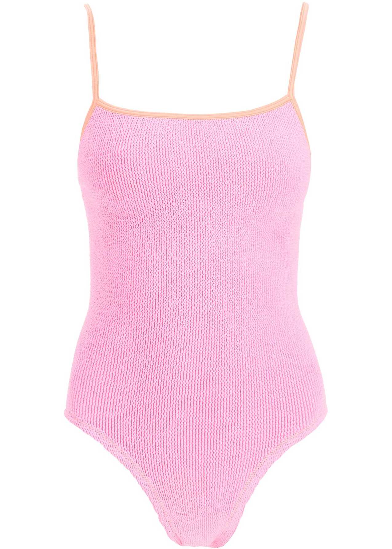 The Agatha one-piece swimsuit by Reina Olga is made of embossed stretch fabric and finished with fluorescent hems. The top features a round neckline and thin straps, while the high-cut bottom is decorated with lurex stitching. The model is 177 cm tall and wears a one-size-fits-all.
