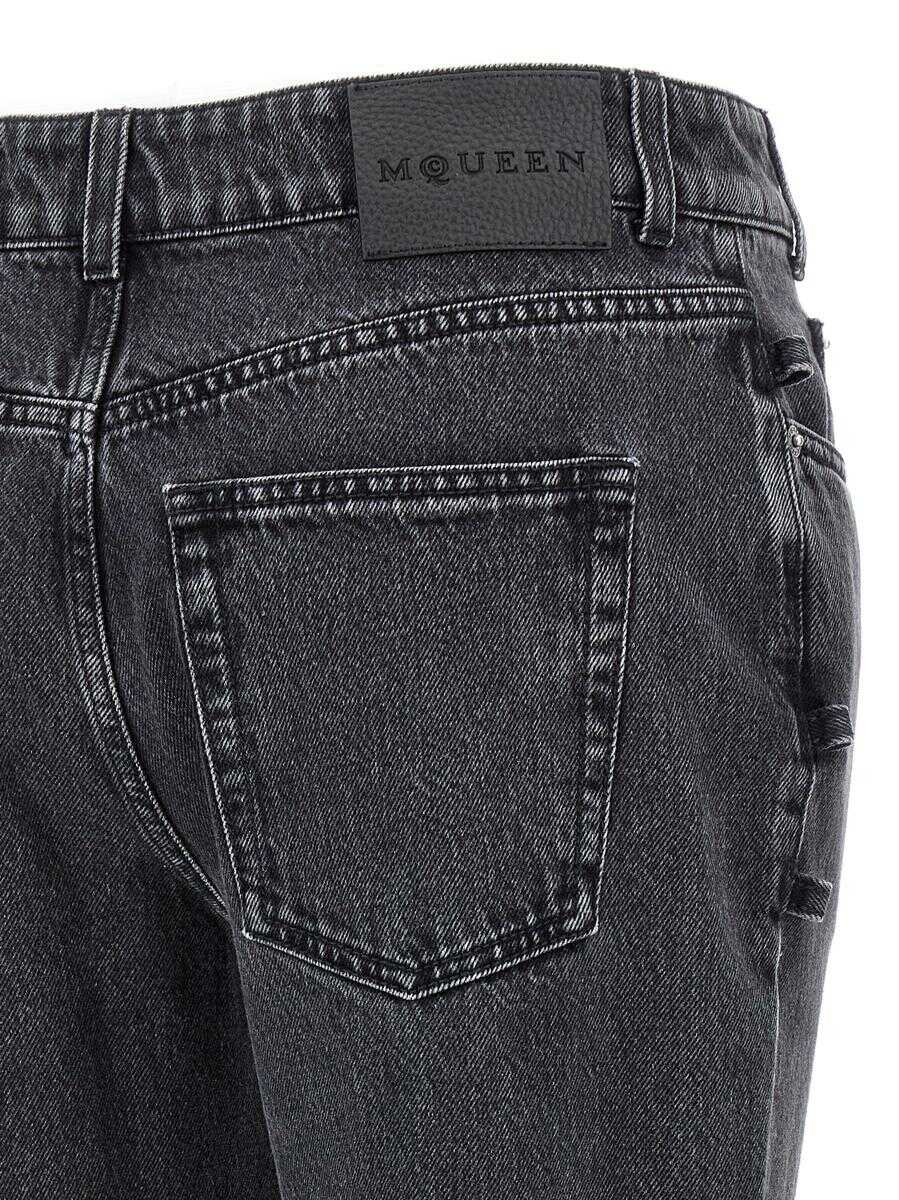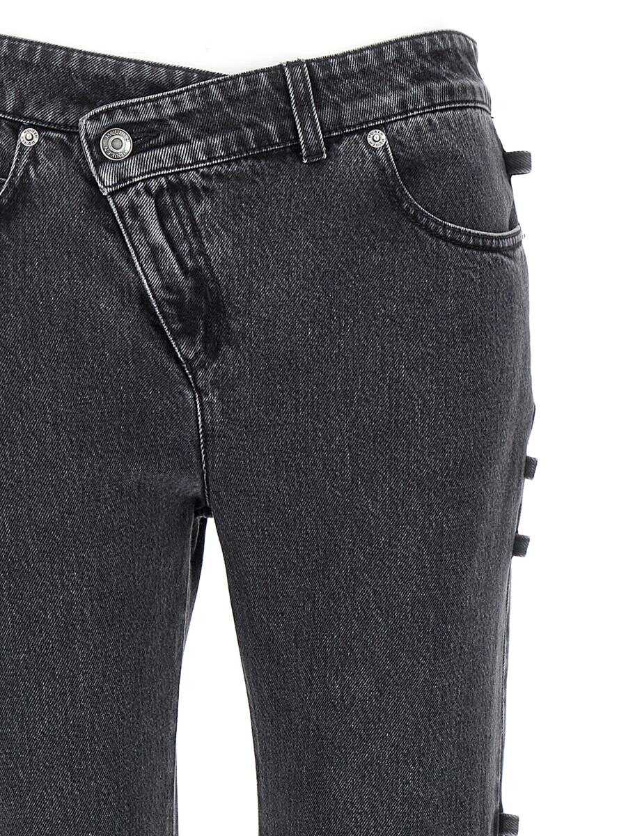 Jeans in black cotton denim délavé, zip and asymmetric button closure, five pockets, leather logo tag
