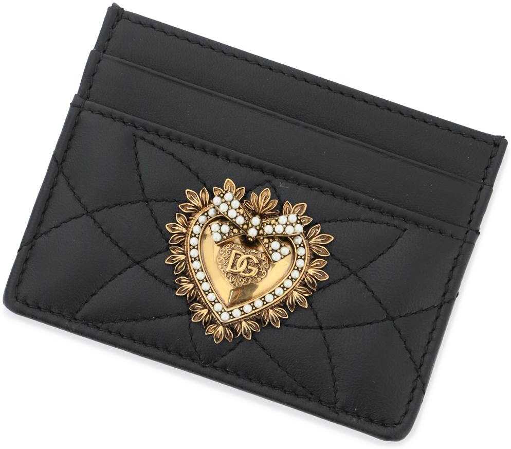 The Devotion card holder by Dolce & Gabbana is made of soft lamb nappa leather with a matelassé detail and an iconic jewel heart in golden metal adorned with small pearls. It features two pockets on each side and a central pocket lined with fabric.