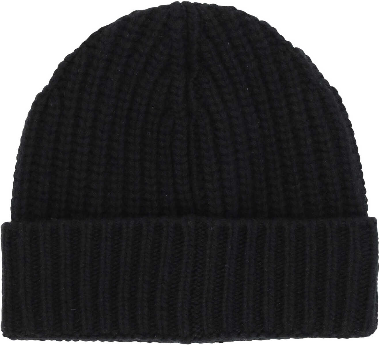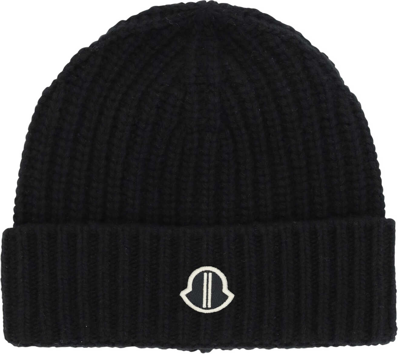 Virgin Wool Beanie Hat by Moncler + Rick Owens, all-over ribbed design, turn-up hem, brand's iconic logo patch applied to the front.