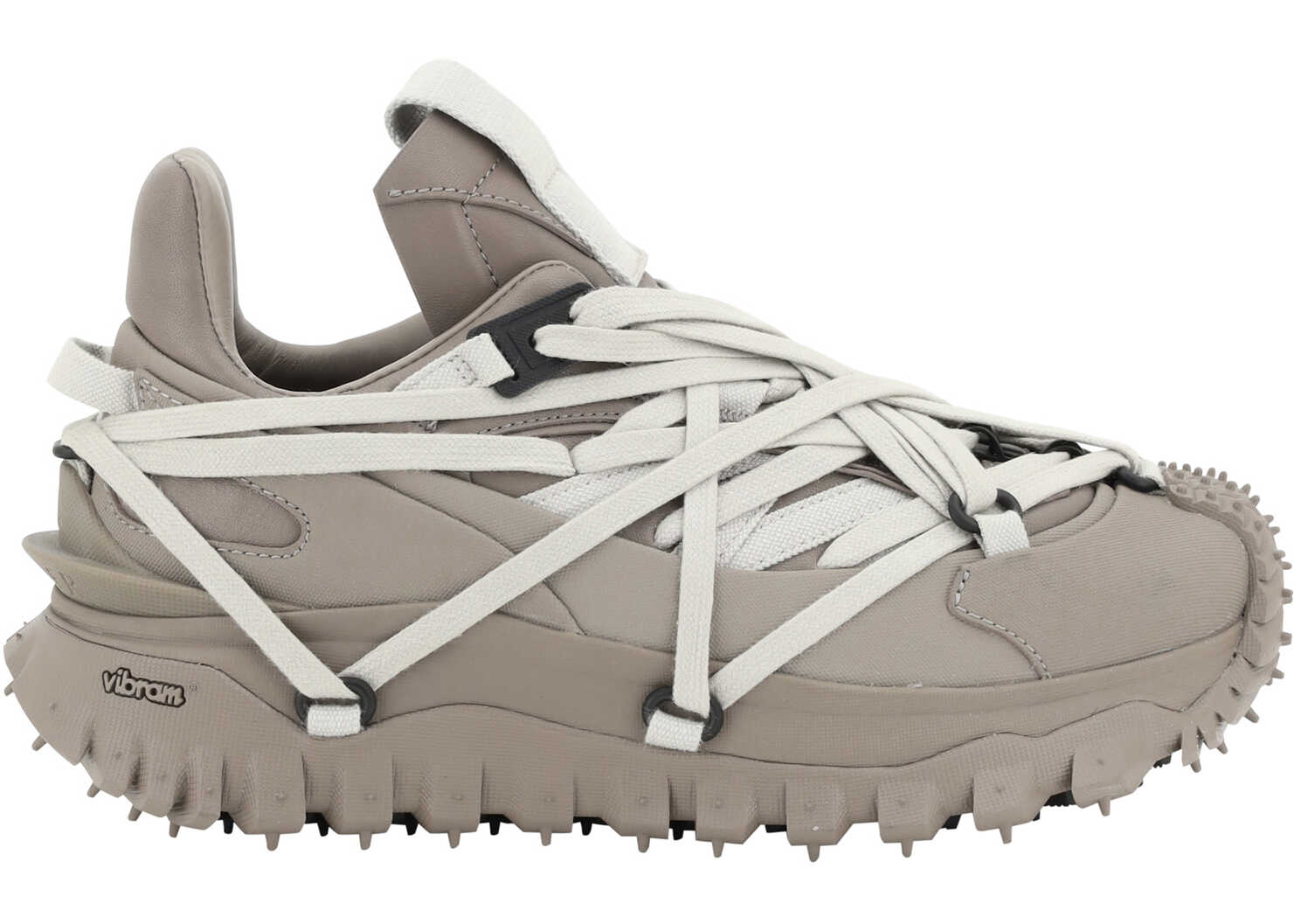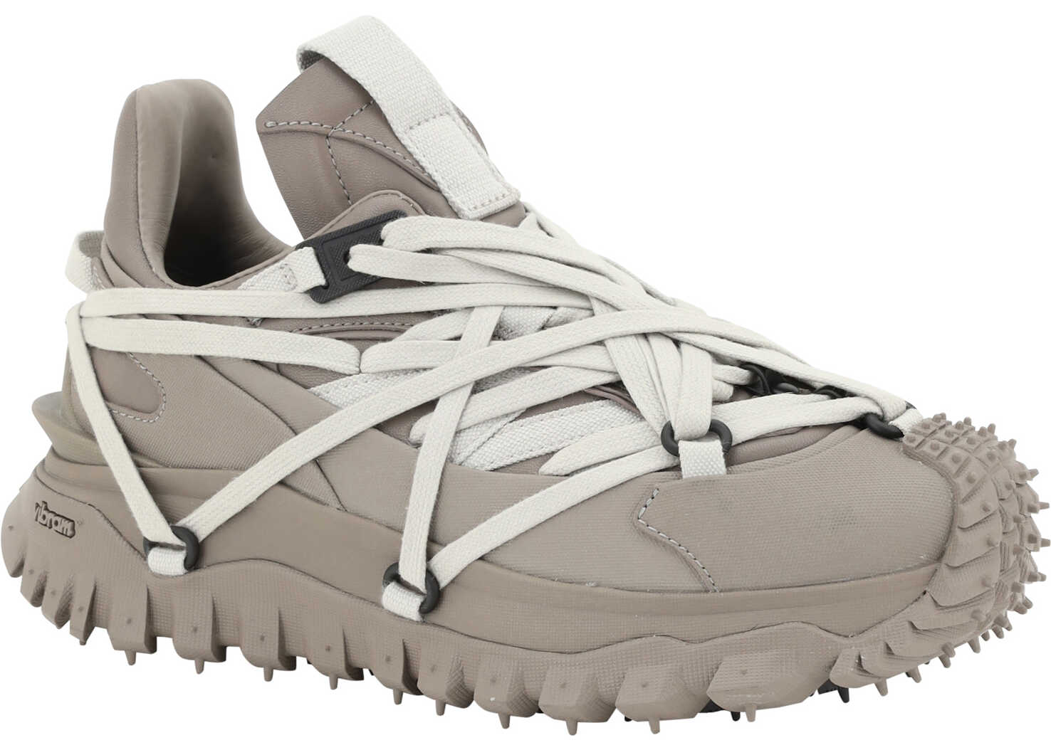Leather Trailgrip Megalace Sneakers by Rick Owens, upper closure by stacked laces, VIBRAM compound rubber tread, reinforced toe, pull tab detail, leather paneled design.